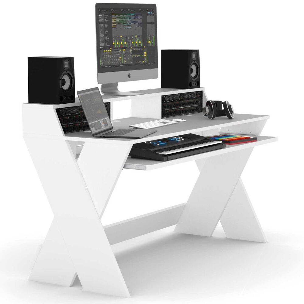 - Offers enough space to set up laptop/computer, screen, studio monitors, audio interface, 19" rack-mount equipment, MIDI controllers, synths and a master keyboard