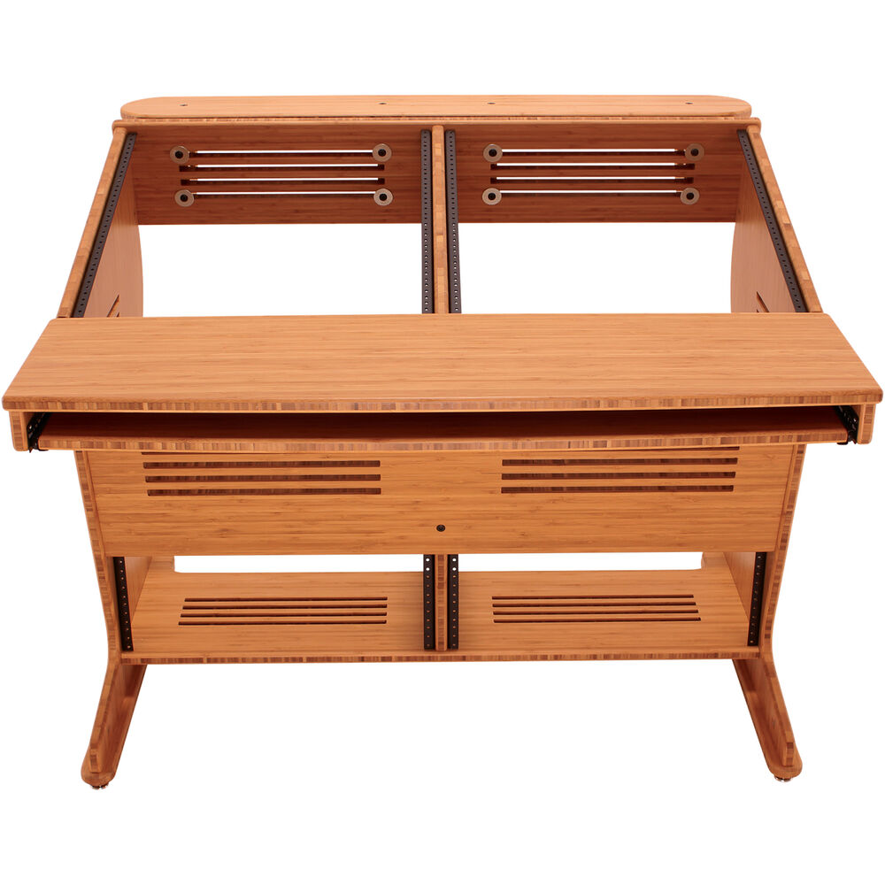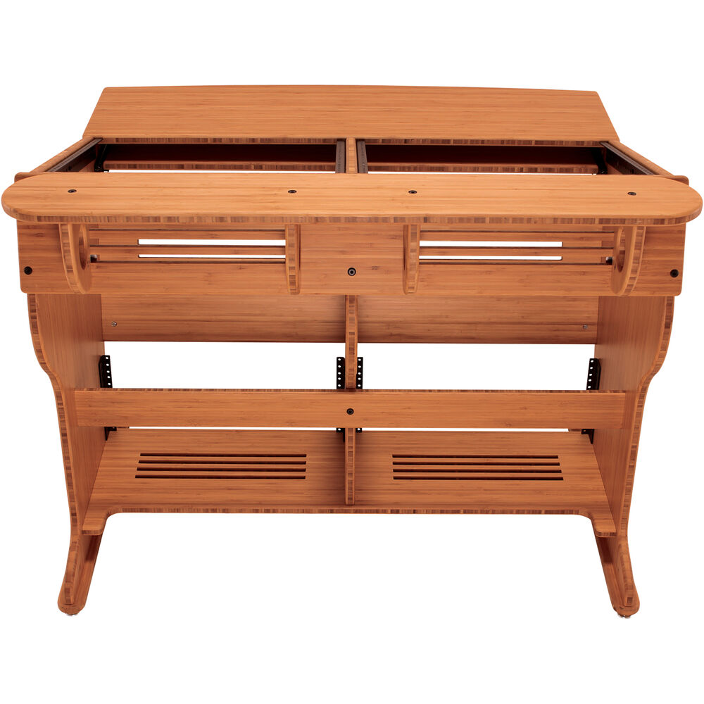 Settle down for creative work on the JamRacks Compact Mastering Desk. This audio workstation features a 41 x 12" work surface, has two 12 RU spaces on top at a 15° angle, and two 4 RU spaces below the work surface. Stash a keyboard and mouse in the pull-out tray. An integrated rear shelf holds a display or speaker monitors. Enjoy long-term use of the desk thanks to a solid bamboo construction.