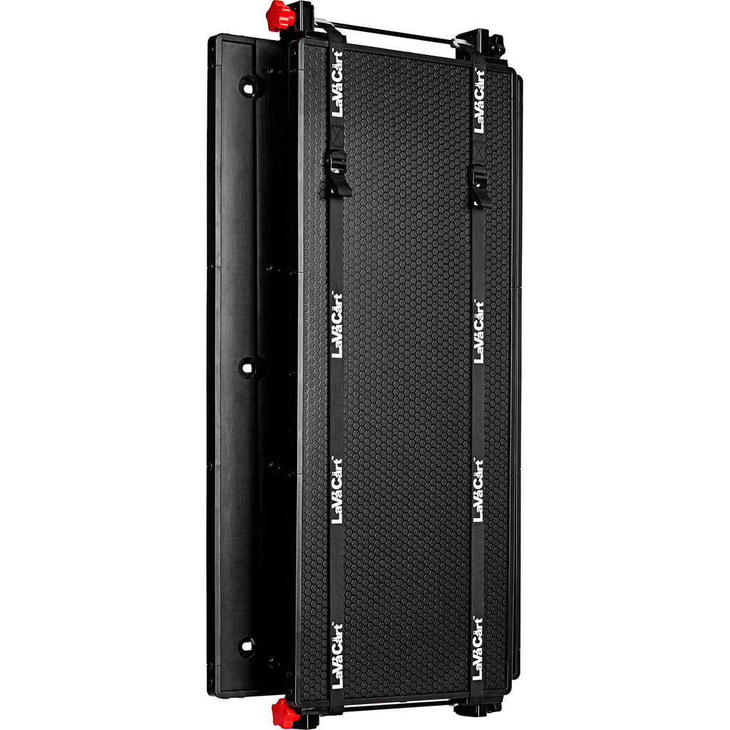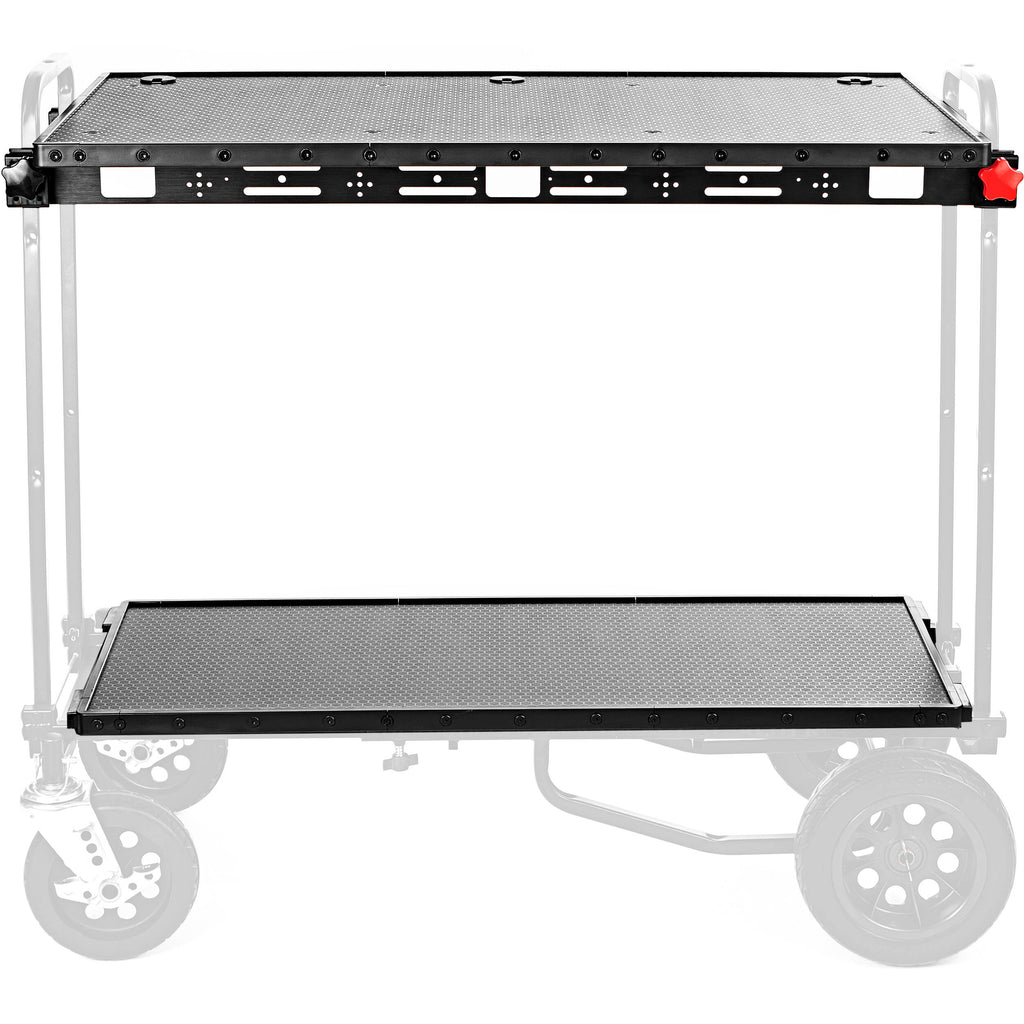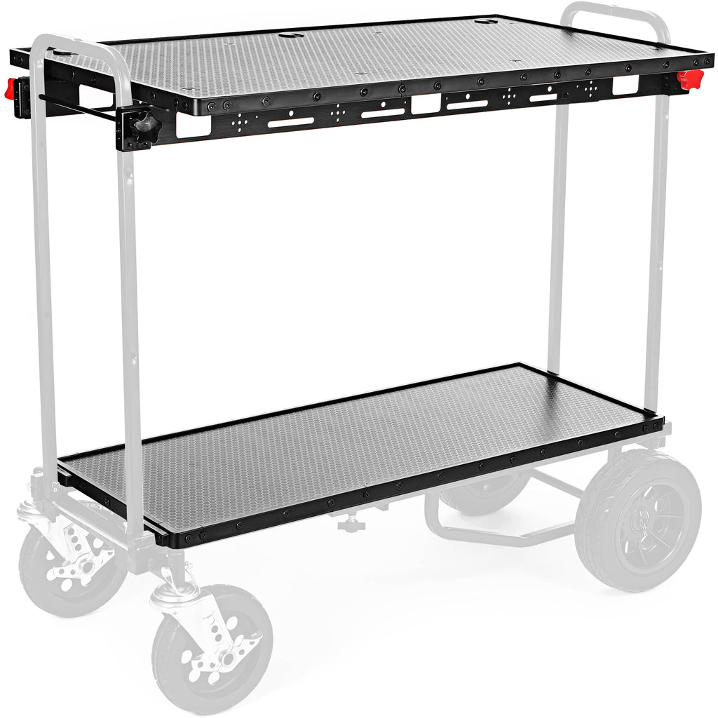Pair this LavaCart EGON Work Surface / Shelf System with a 40" long production cart to create a strong and stable mobile working platform suitable for in-studio, on-set, and location work. Compatible with many RockNRoller carts, as well as carts from other manufacturers, this collapsible dual shelf system can be easily assembled or disassembled, without the need for tools. The shelf system features three grommet holes, providing for cable management and monitor mounting, while the support rails feature numerous 1/4"-20 and 3/8"-16 threaded accessory mounting holes.