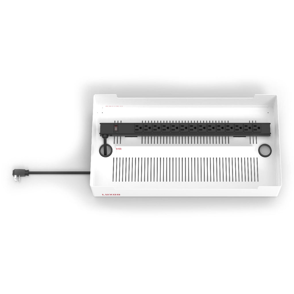 The 12-Slot Desktop Charging Station for Laptops & Mobile Devices from Luxor is an ideal solution for classrooms, libraries, medical offices, or anywhere you need a central location to charge many mobile devices. The top of this unit features an open-air design and 12 slots to accommodate smartphones, tablets, and laptops with screens up to 16". Everything is powered by the 14-outlet UL-Listed power strip in the base. There's plenty of room next to the strip for your device cables and power adapters, keeping them organized and out of view.