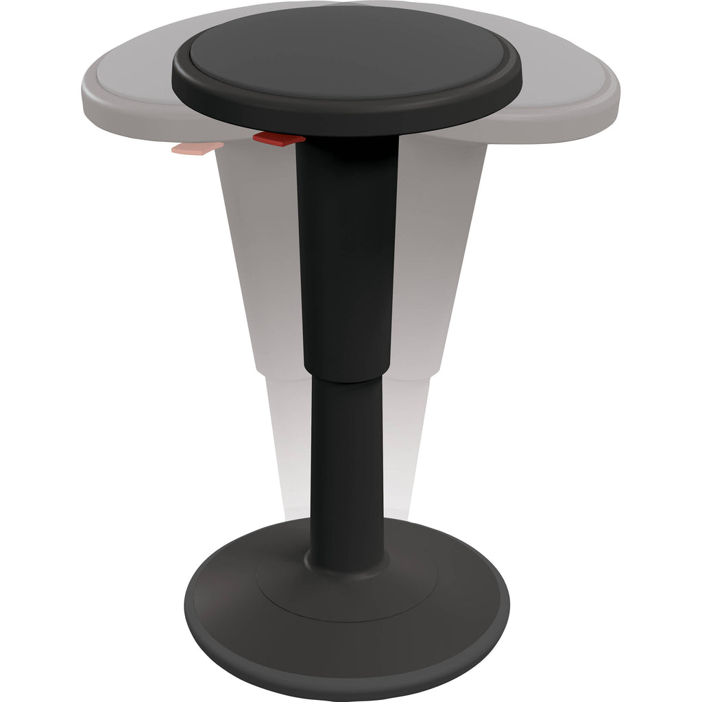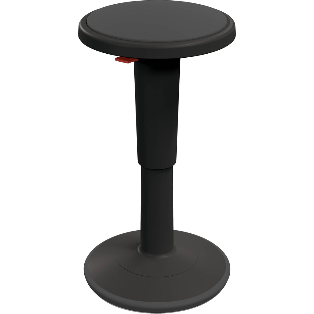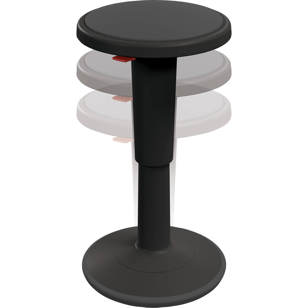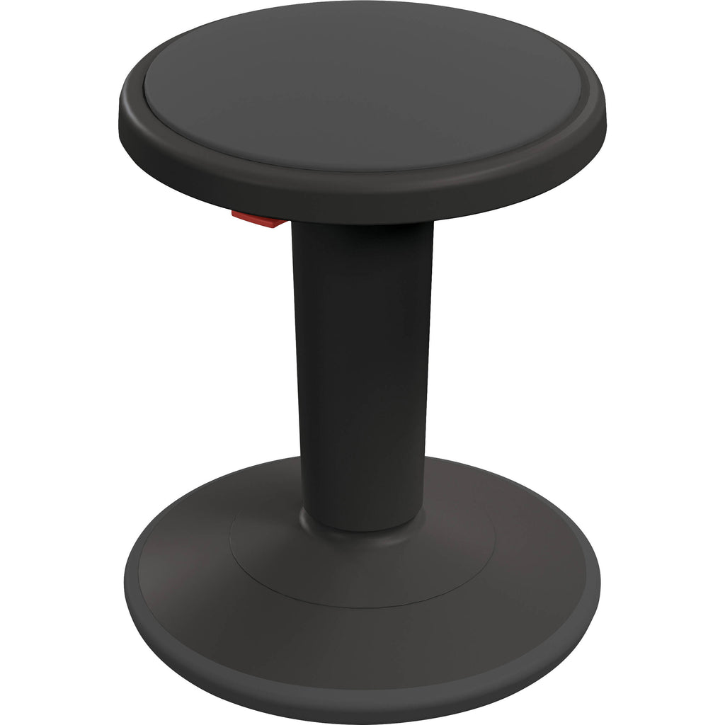 The short black MooreCo Hierarchy Grow stools offer a unique alternative to student chairs, allowing for an adjustable seat height of 14 to 18" Built to "wobble", these stools help ease student discomfort from sitting still for extended periods of time, while allowing them to stay focused in the classroom