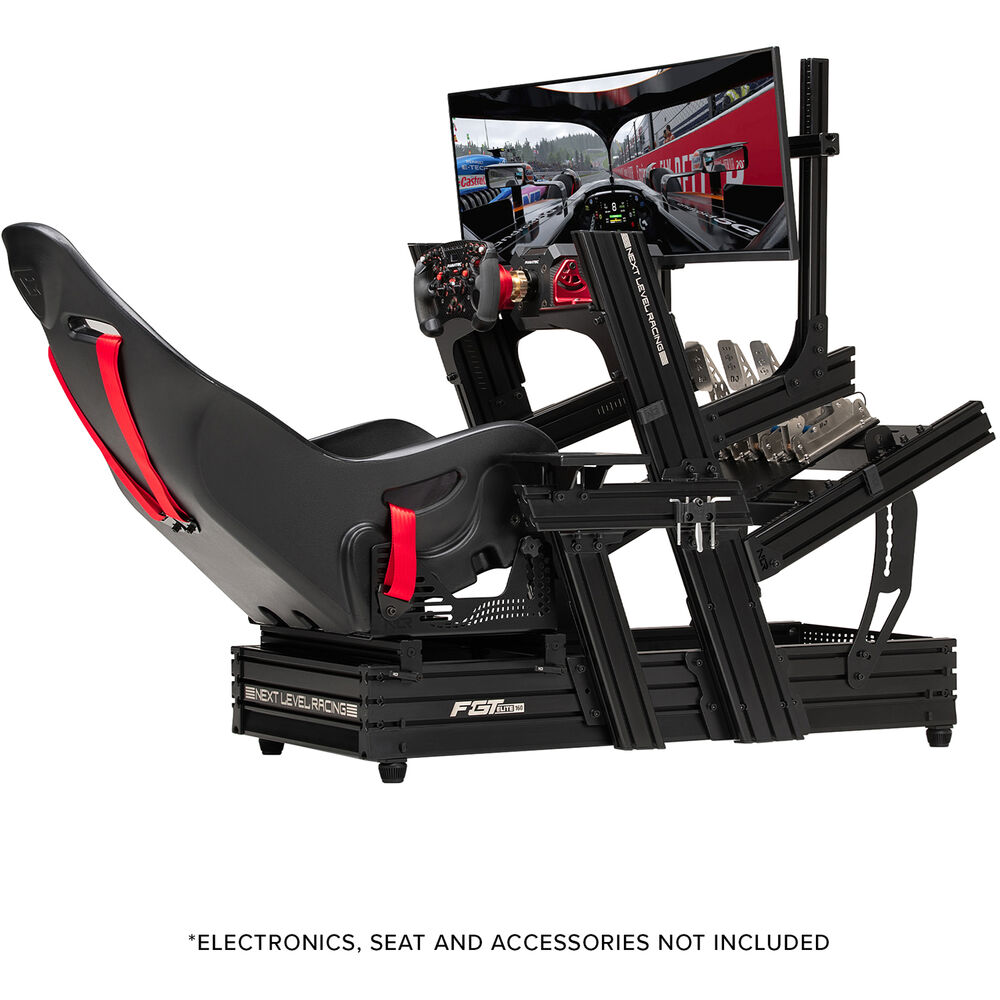 Next Level Racing features side and front plates and is compatible with most industry standard simulator wheelbases, pedals, and other equipment. It is constructed of strong aluminum extrusions for a sturdy base without the need for cumbersome support brackets. The cockpit setup is completed by additional immersive Next Level Racing components available separately.