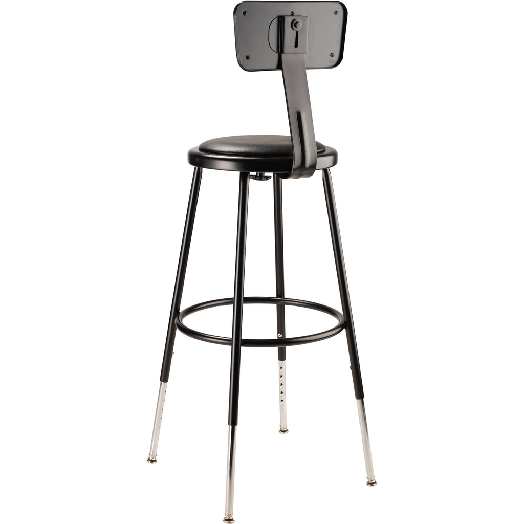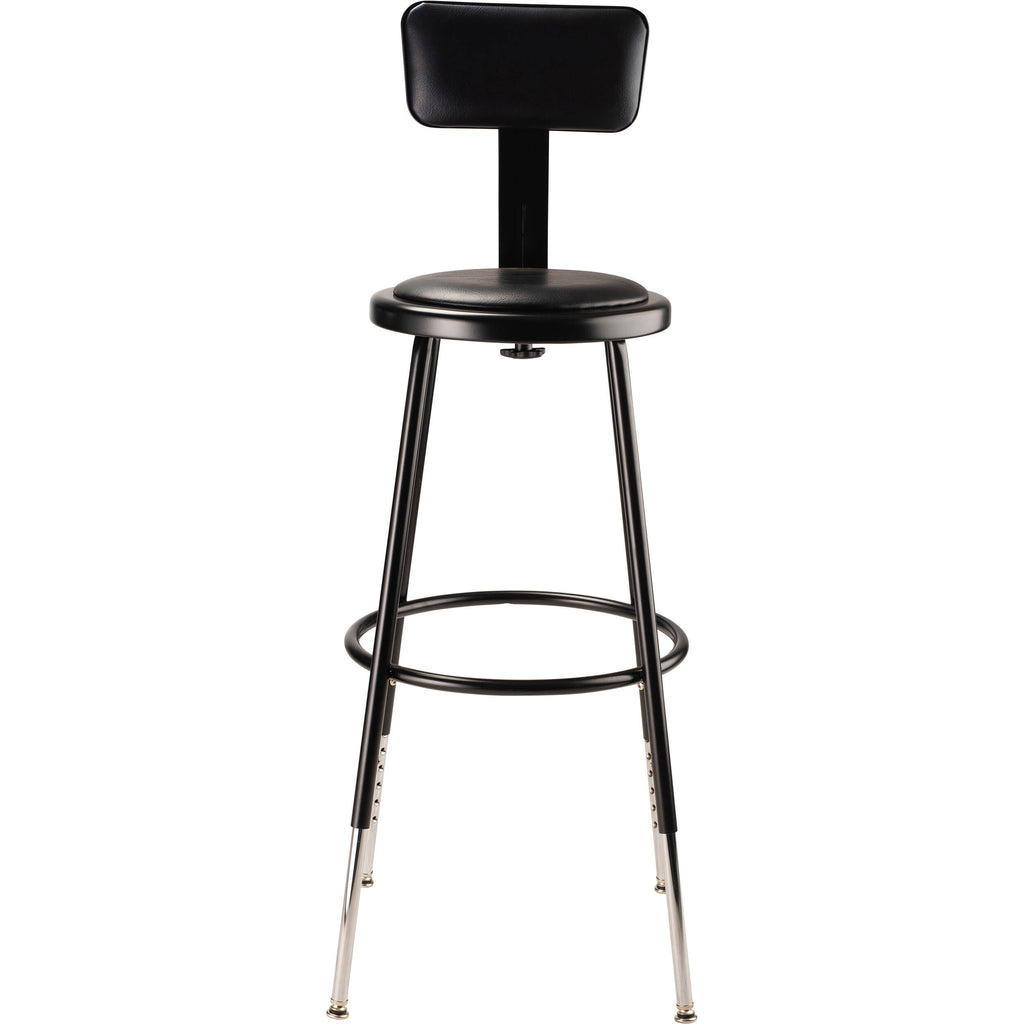 This Vinyl Padded Adjustable Height Stool with Backrest from Oklahoma Sound is ideal for hands-on educational settings like art rooms, science labs, home economics, or shop classrooms. This reliable stool features a sturdy frame of 18-gauge steel tubing securely welded to a 14" diameter seat pan. The seat features an 11.5" diameter black vinyl cushion that will provide years of comfortable and dependable use. Adjustable-height legs extend from 24.5 to 32.5" in 1-inch increments. The adjustable 6 x 12" padded backrest can be moved two inches up/down and forward/back for optimal comfort and support. A durable steel footrest ring is securely bonded to each leg with welded contact points.