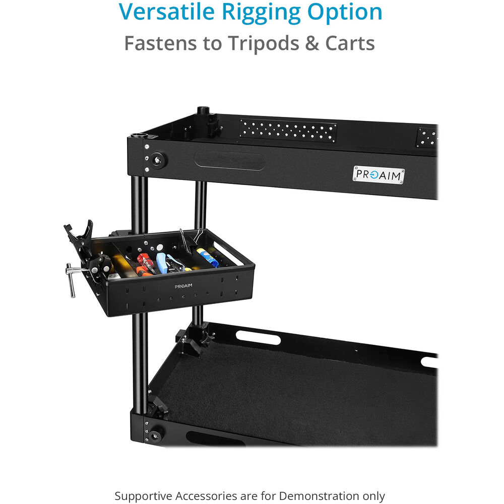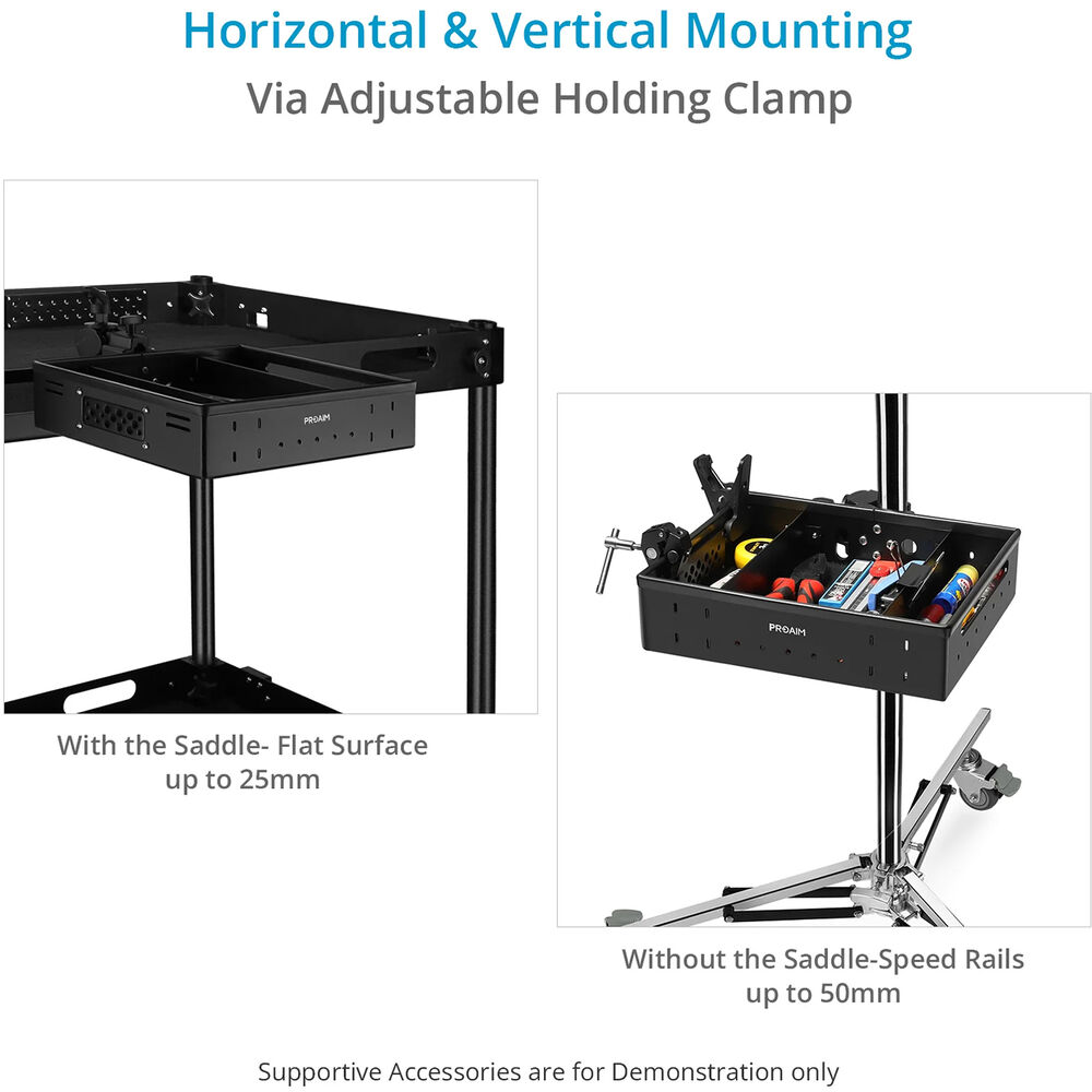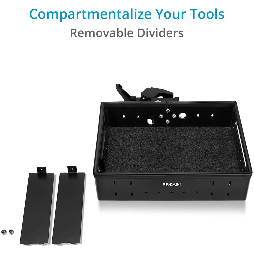 Secure this Proaim Camera Assistant Front Tray to your video production or sound cart and organize small, lose accessories. The tray features an adjustable mounting clamp that can be configured in vertical and horizontal configurations. The clamp is compatible with up to 1" thick flat surfaces or up to 2" speed rails. Removeable trays can further separate your small accessories and multiple 1/4"-20 and 3/8"-16 threads can attach additional accessories to the tray. Its aluminum construction ensures a durable design.