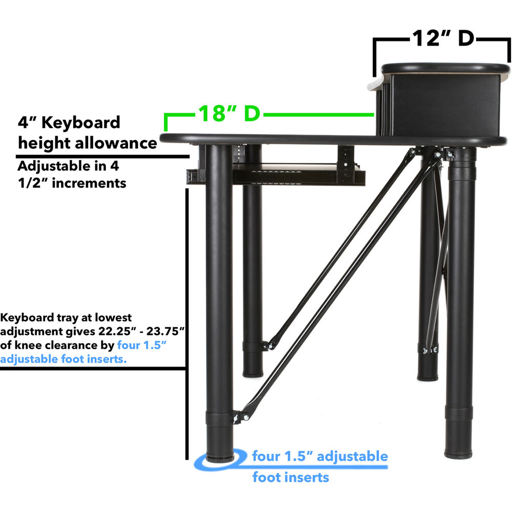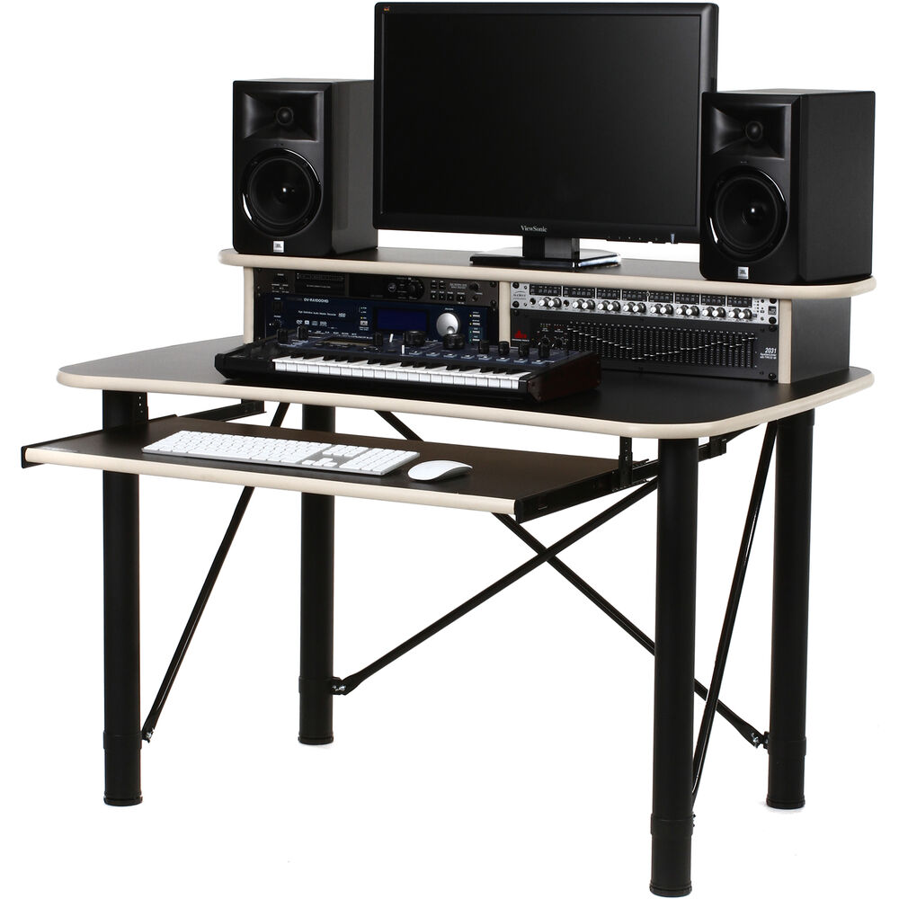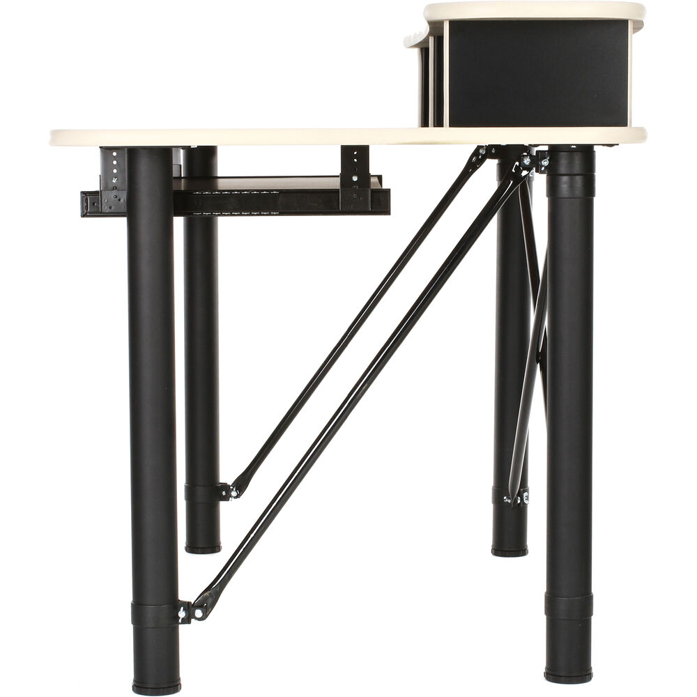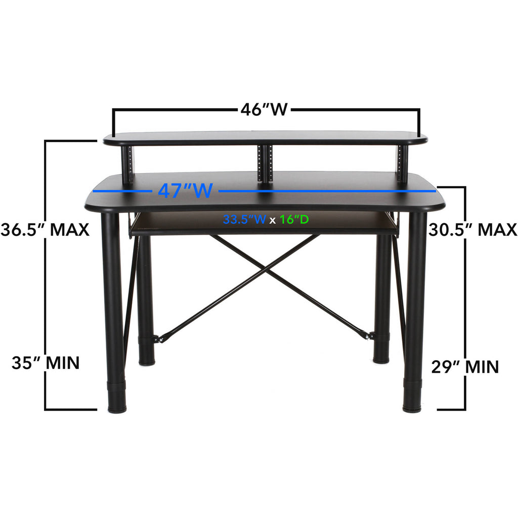 Settle down and get creative with the black and almond trim ProRak 48 6 RU Audio Workstation with Pull-Out Keyboard Tray from RAB Audio. This audio workstation features two 3 RU rack bays and a 33.5 x 16" pull-out keyboard tray. Take advantage of the 47 x 32" main work surface for a large working area. A secondary top shelf supports additional equipment or a computer display. A 24" knee clearance makes for a comfortable sitting experience for most users. Find the best desk position with the height-adjustable steel tube legs. A 100 lb weight capacity securely holds your creative equipment.