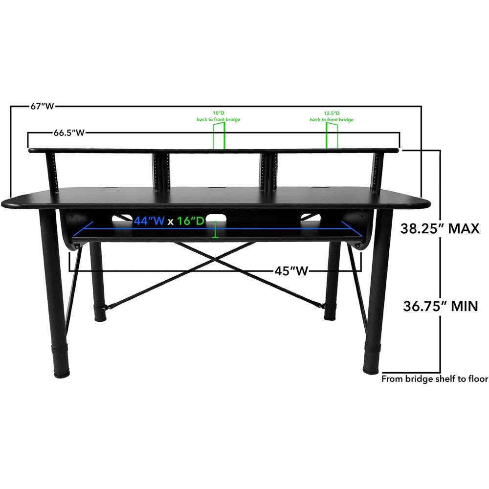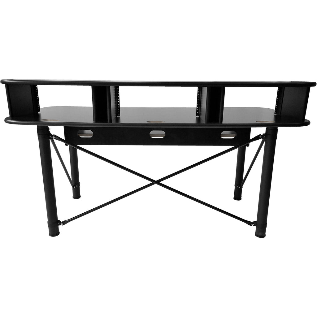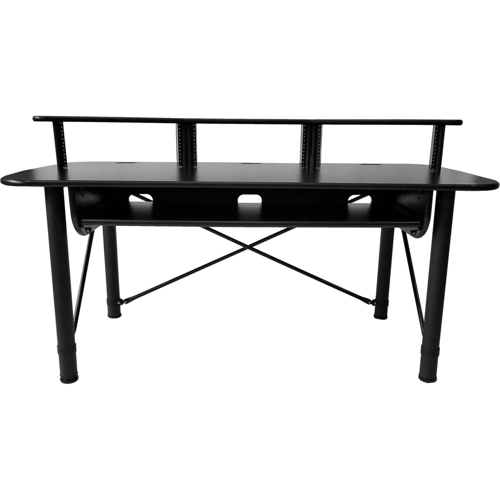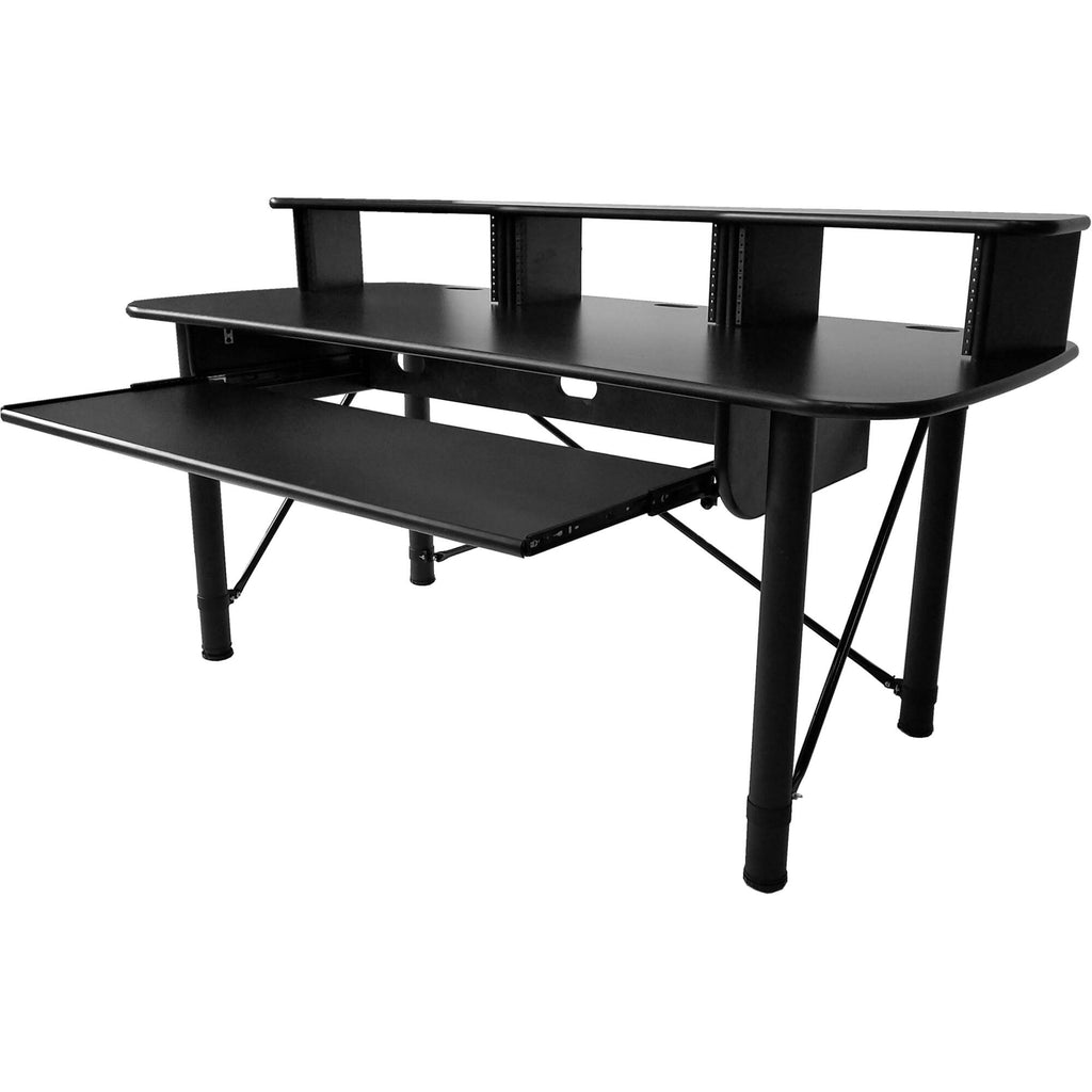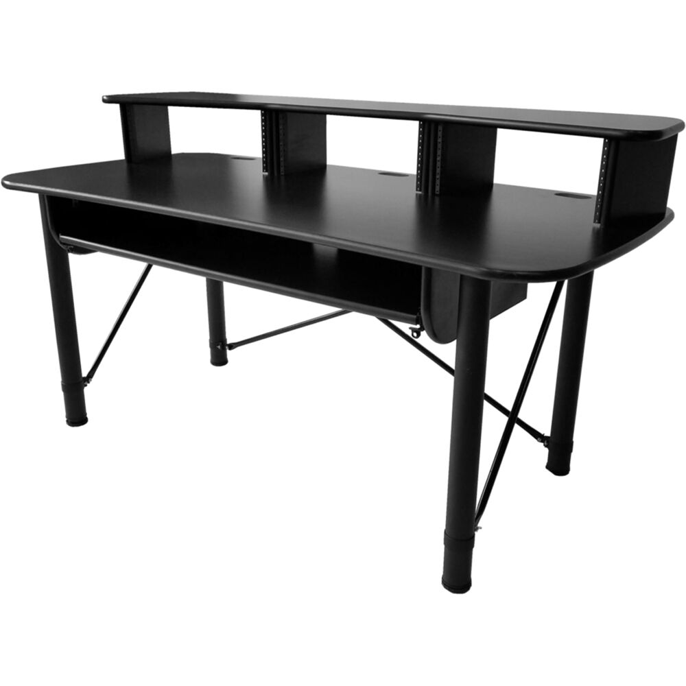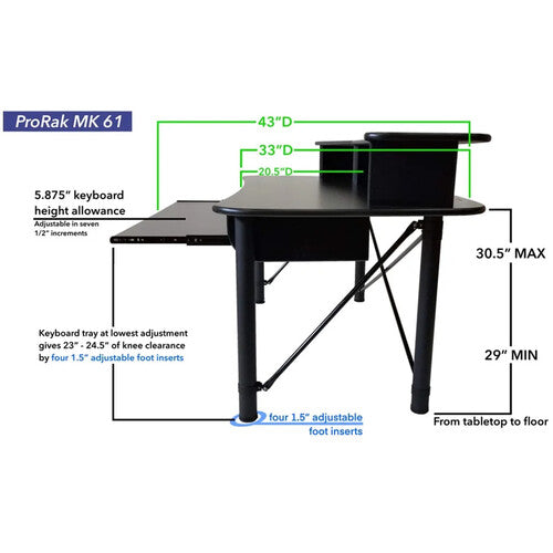 Settle down and get creative with the ProRak MK 61 Audio Workstation with Three 4 RU Rack Bays and 61-Key Keyboard Pullout Tray from RAB Audio. This studio desk features three 4 RU rack bays for audio components and other rack-mounted equipment. A 67 x 33" main work surface accommodates your equipment plus a laptop. Stash your 61-key keyboard in the 44 x 16" pullout keyboard tray. A 67" wide secondary shelf accommodates speaker monitors and a computer display. Find an optimal setup with the 29 to 30.5" height-adjustable steel tube legs. A 100 lb weight capacity securely holds your equpment.