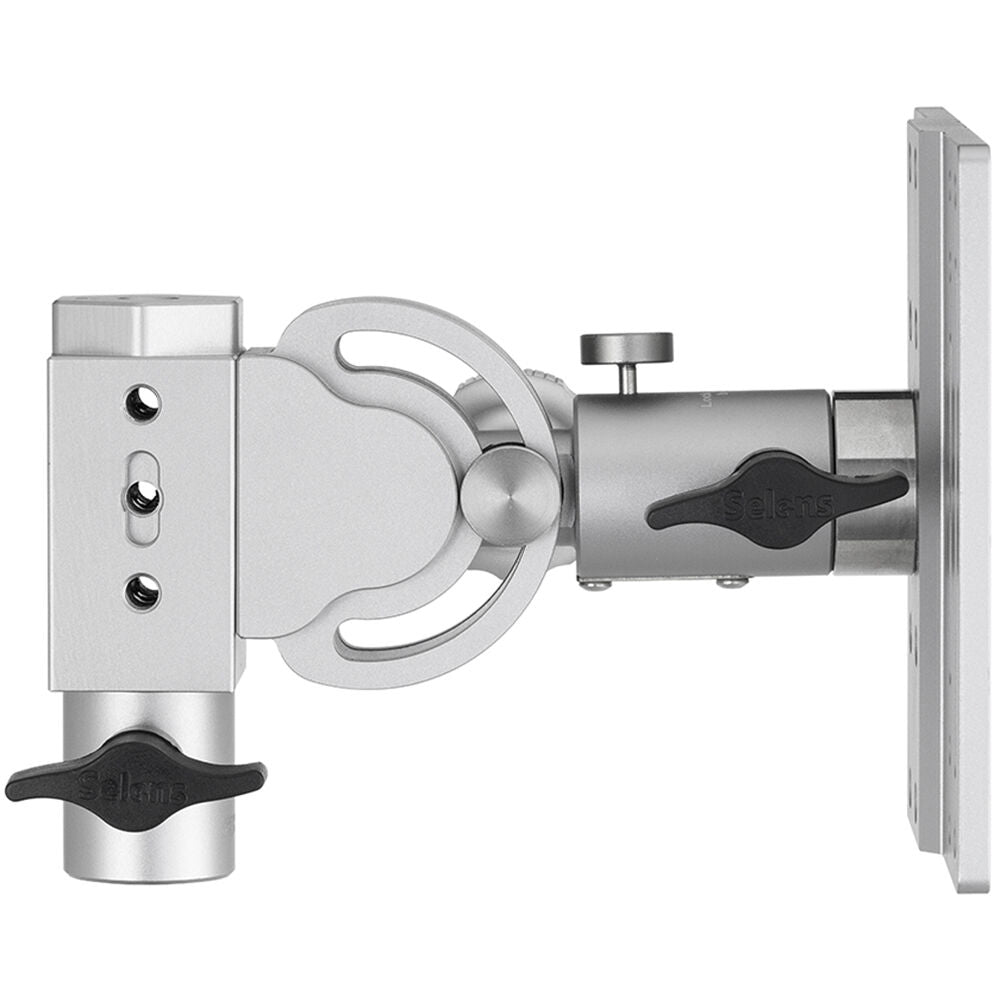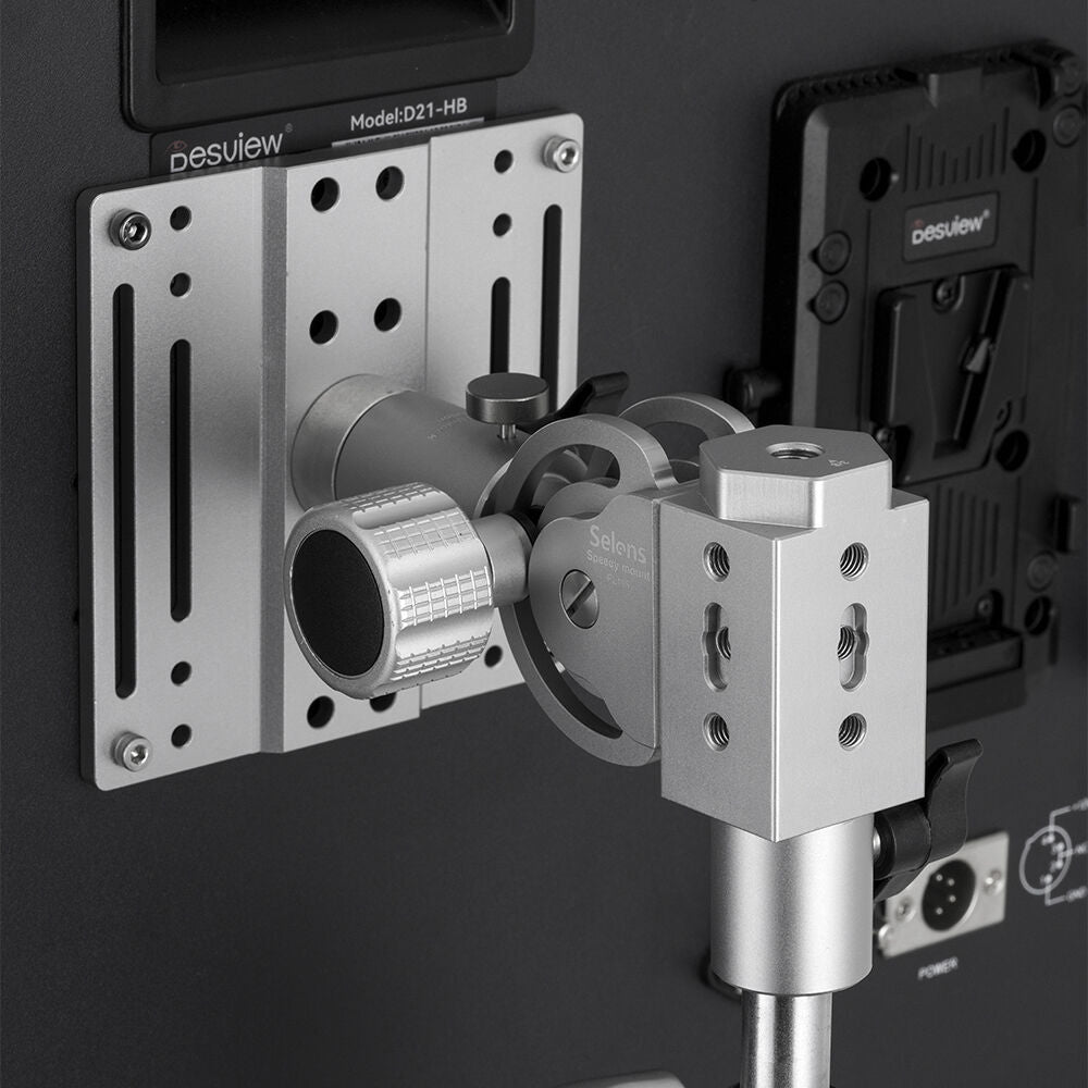 Mount this Selens Monitor Arm onto the back of your monitor with a 75 or 100mm VESA pattern. This arm supports up to 22 lb and allows you to mount your monitor on a light stand with a baby pin. Once mounted, the arm has 90? of tilt, and an integrated safety release helps prevent accidental release. The arm also features a 3/8"-16 threaded hole for mounting wireless video transmitters, small monitors, audio devices, and other accessories. In addition to being compatible with VESA 75 and 100mm monitors, it can also work with quick release accessories such as the Selens Quick Release Monitor Mount Plate.