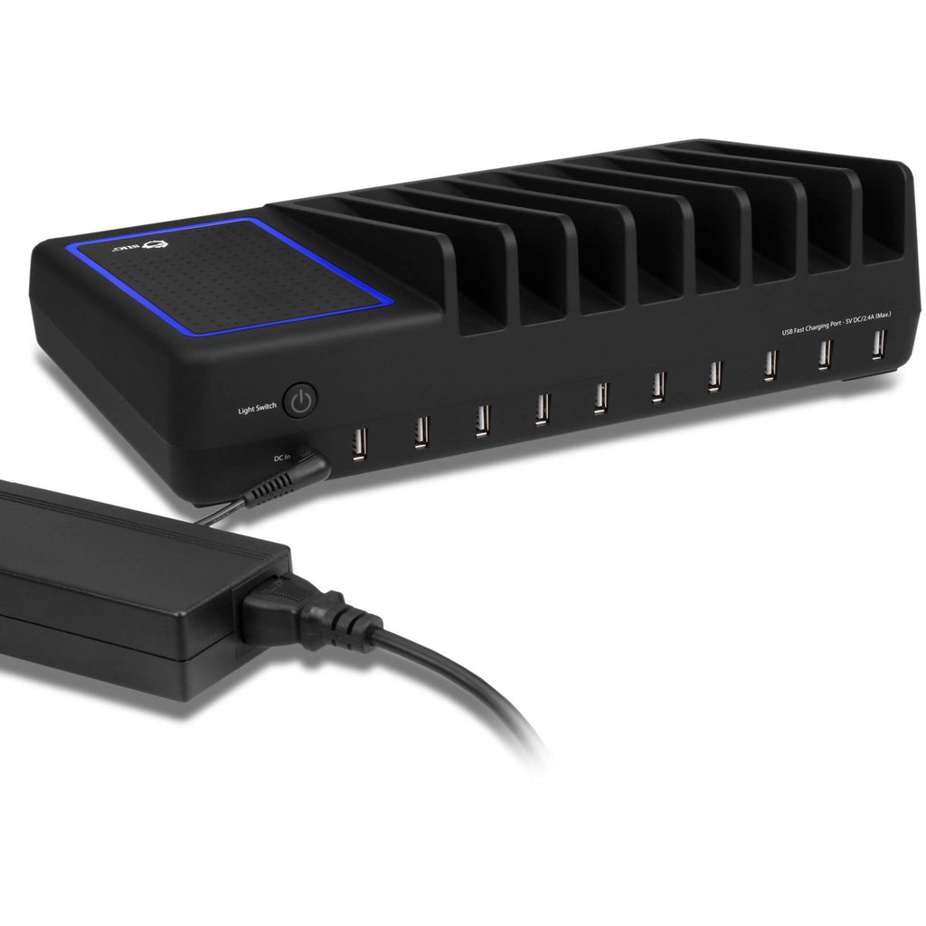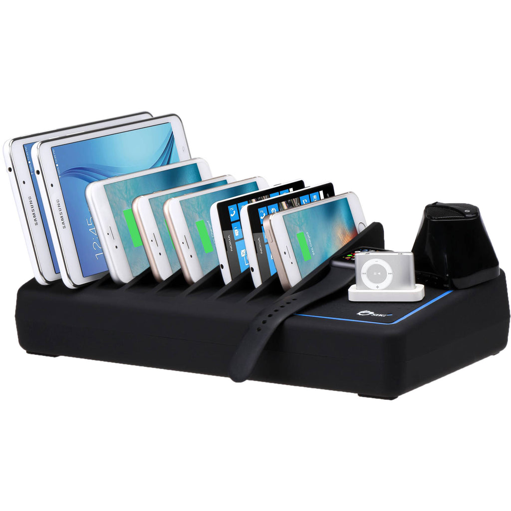 Clear up the clutter when charging your mobile devices with this 10-Port USB Charging Station with Lighted Deck from SIIG . This charging station features ten USB Type-A ports that each supply up to 2.4A of power to your devices. To keep things organized, the top of the charger includes eight slots for various smartphones and tablets, and a small non-slip, padded deck to hold a ninth device, or for smaller items, such as wireless earbuds or a smartwatch. Ringing the deck is an LED light that emits a soft glow, which can be shut off manually if desired.