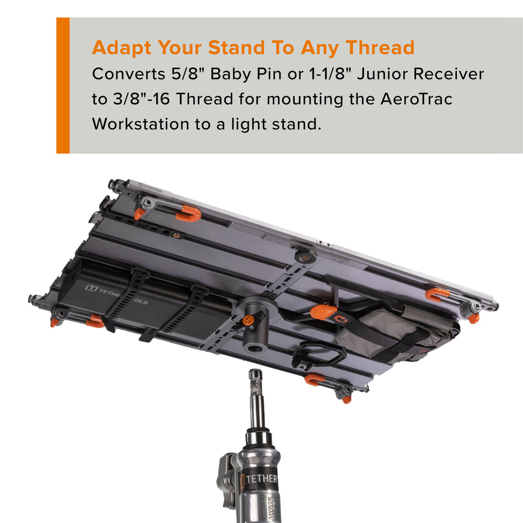 Maximize gear flexibility with the Rock Solid Baby Ballhead Adapter from Tether Tools. This adapter will connect your AeroTrack Workstation, or other gear with a 3/8"-16 thread to light stands, C-stands, production carts, and grip arms with a 5/8" baby pin or 1-1/8" receiver. Built entirely out of metal, this adapter supports up to 55 lb and offers rugged and reliable support, both in the studio and field environments. Working in tandem with the versatile 3/8"-16 thread is an ergonomic knob that helps ensure a secure lock with user-friendly, tool-free adjustments.