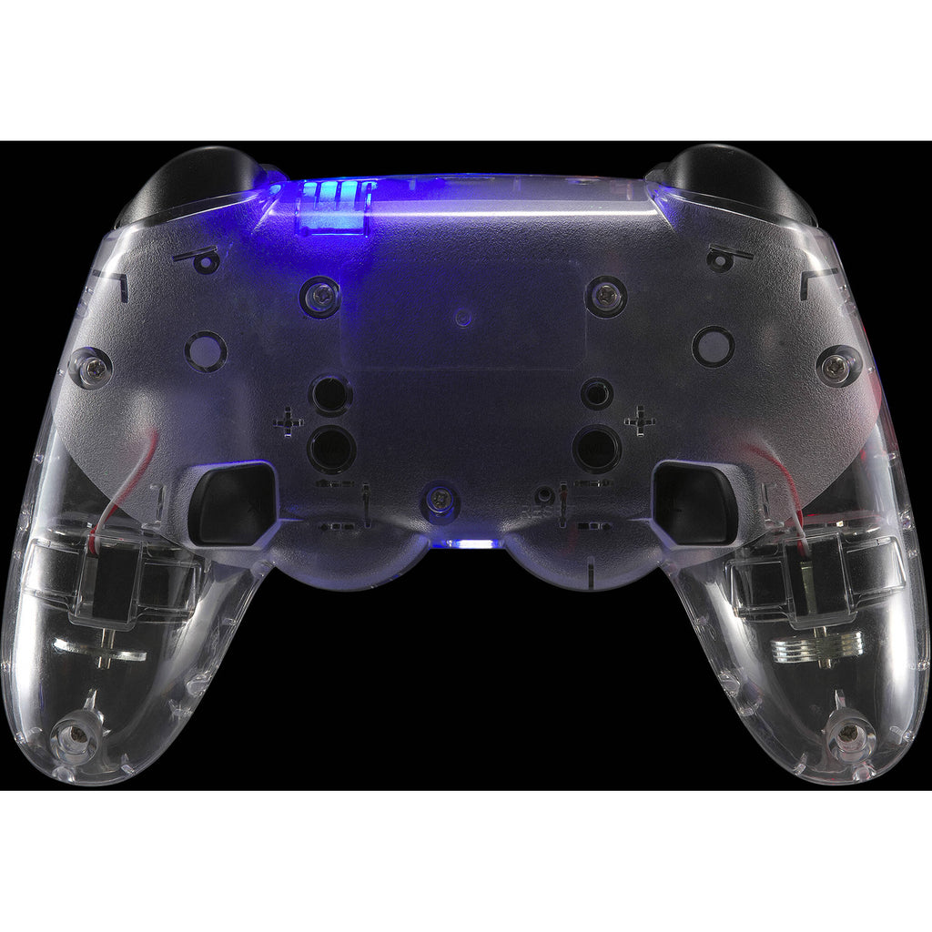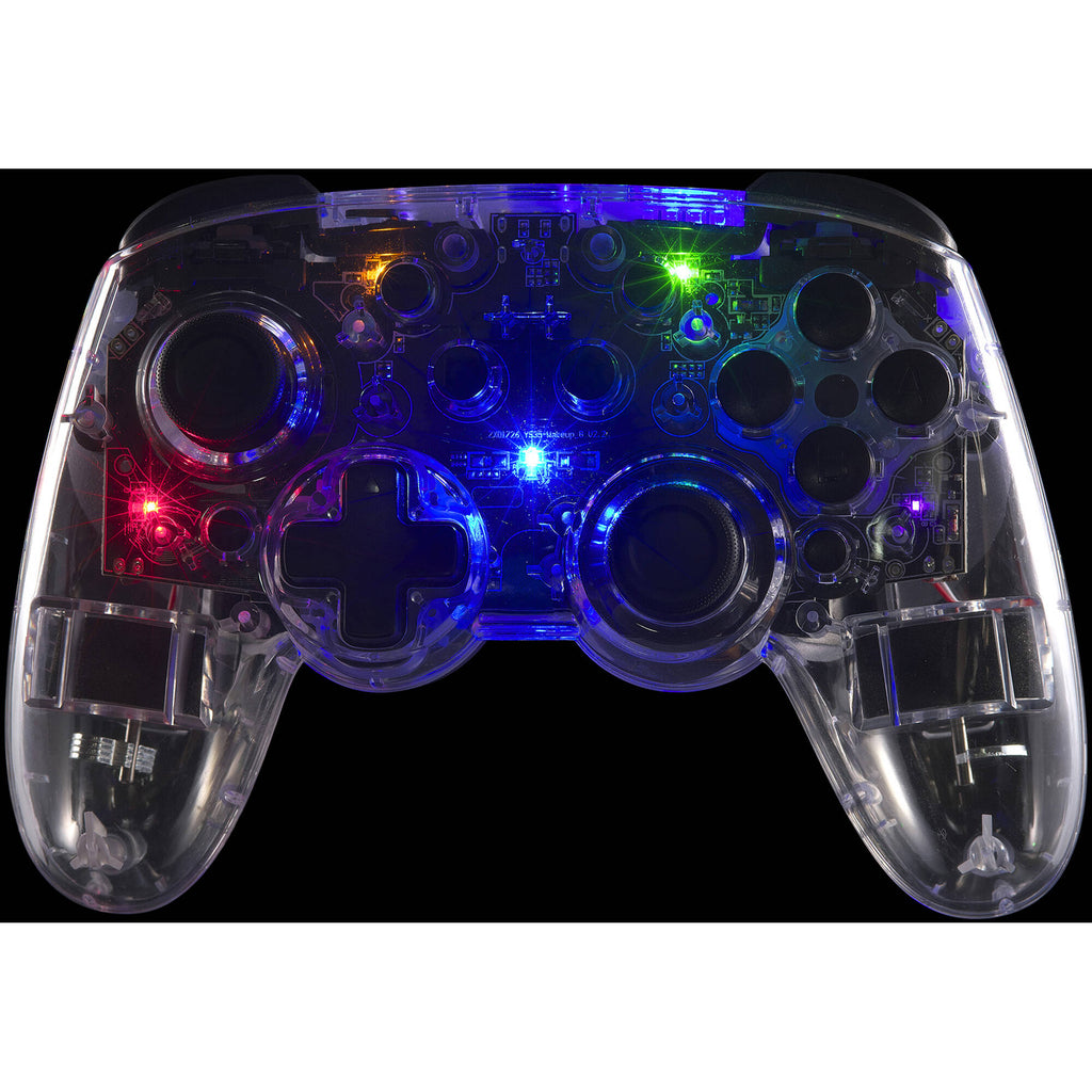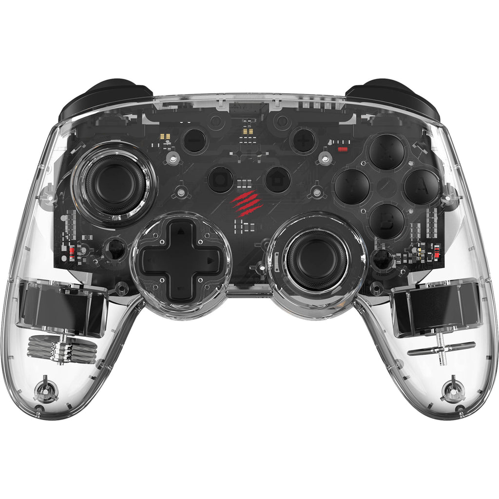 The Mad Catz C.A.T. 9 Wireless Game Controller connects via Bluetooth or USB-C and boasts two programmable buttons, a turbo function with dual vibration systems, and six-axis motion sensor. The transparent shell is complemented by eight-color RGB illumination.