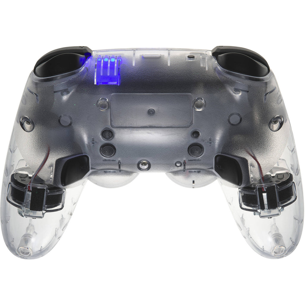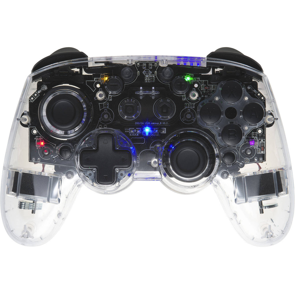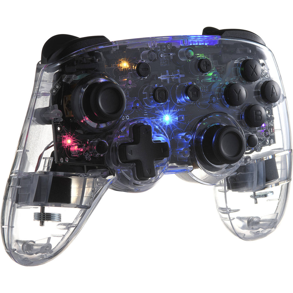 The Mad Catz C.A.T. 9 Wireless Game Controller connects via Bluetooth or USB-C and boasts two programmable buttons, a turbo function with dual vibration systems, and six-axis motion sensor. The transparent shell is complemented by eight-color RGB illumination.