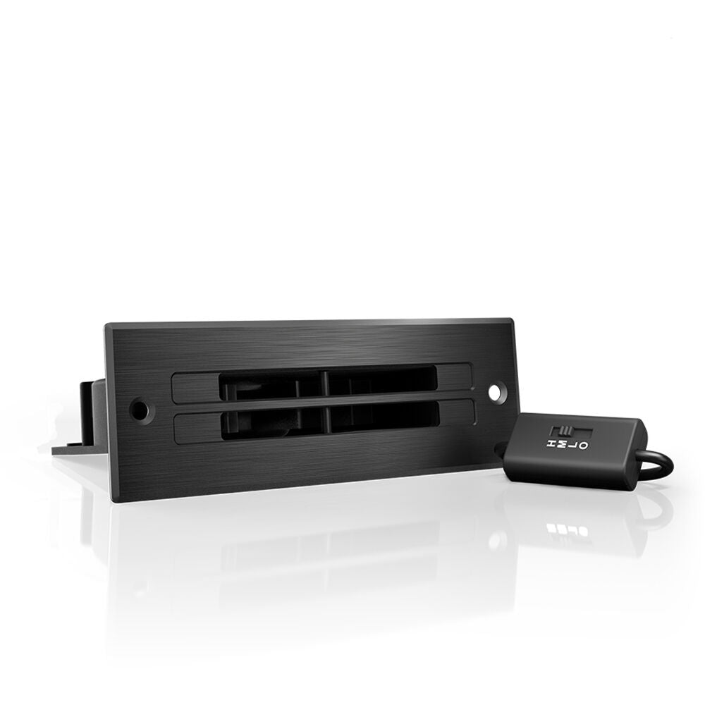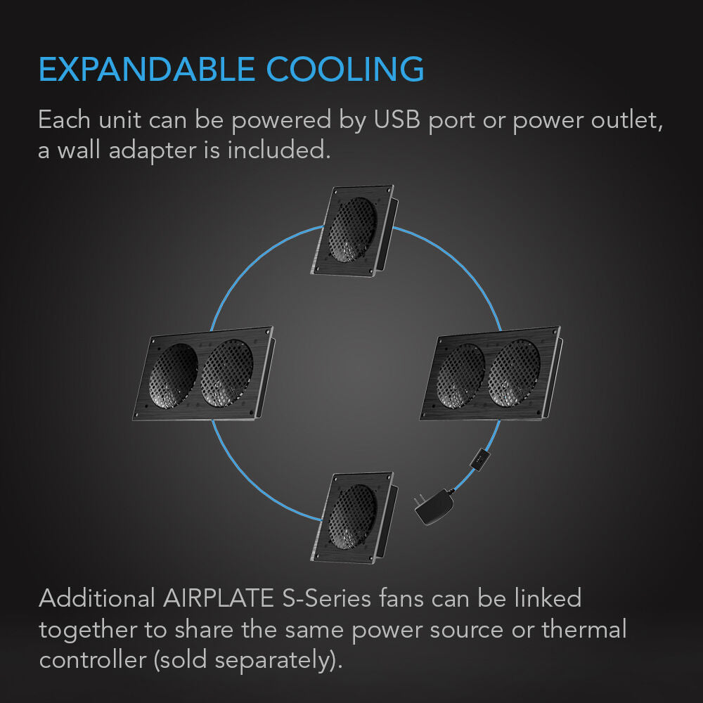 The ultra-quiet blower system is designed to cool home theaters, entertainment centers, and audio video cabinets. The unit's low-profile design is ideal where mounting space is limited or a smaller footprint is desired. Features a speed controller and 6 foot power cord. Included fans use a custom motor engineered to minimize noise during speed variations and are certified by CE and RoHS. Contains AC Infinity axial fans ACX-FBD1225(B)05W5 which meet UL-507 standards for safety under Underwriters Laboratories certificate E503903. Contains AC Infinity axial fans <> which meet UL-507 standards for safety under Underwriters Laboratories certificate E503903. Containing dual ball bearings rated at 67,000 hours, the unit can be mounted in any direction. Features a CNC-machined anodized aluminum frame with a modern brushed black finish. Blowers are set to exhaust air out of the enclosure. Includes all necessary hardware to easily mount the unit onto a cabinet and power it through an USB port or standard wall outlet.