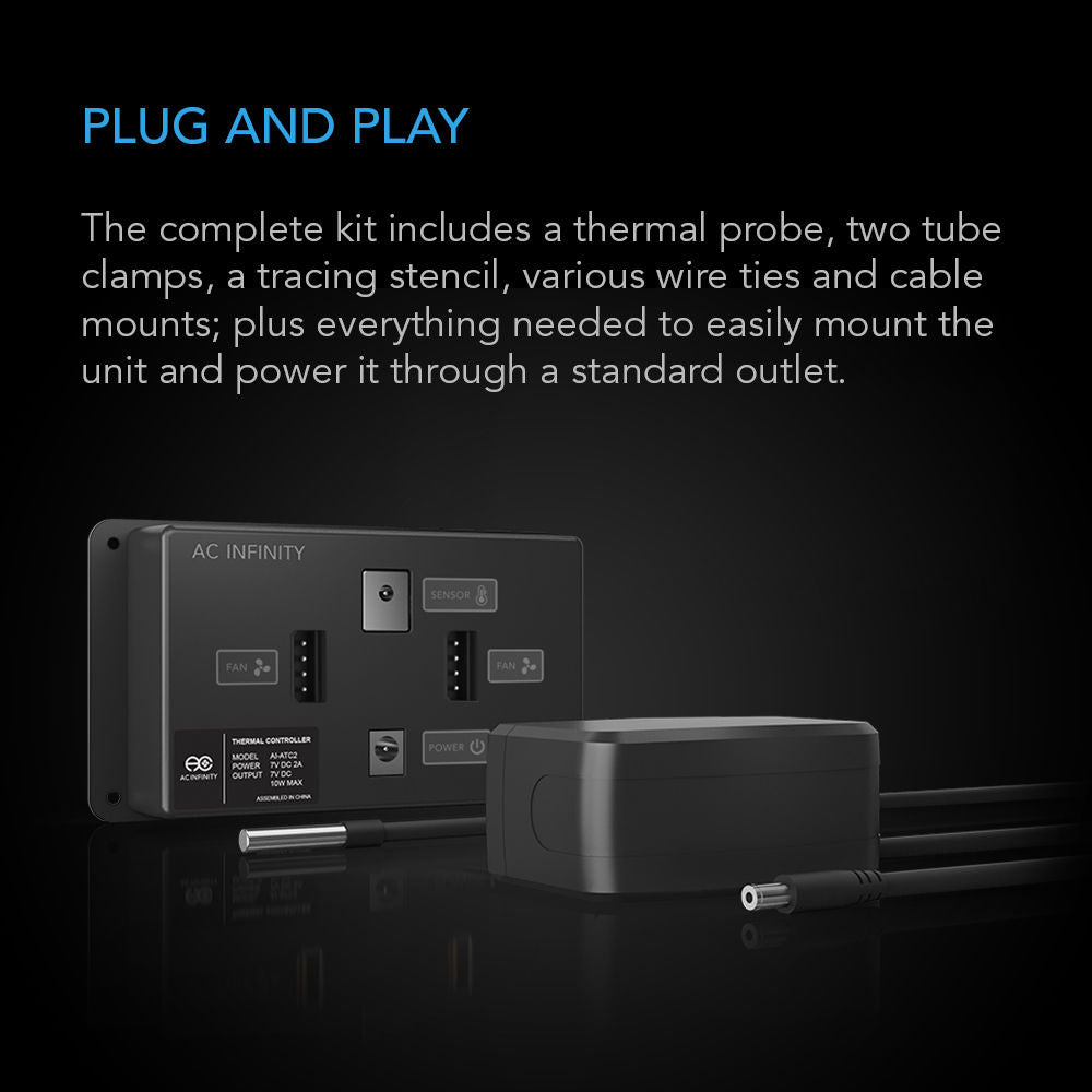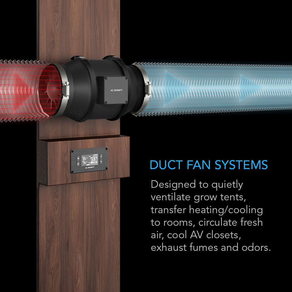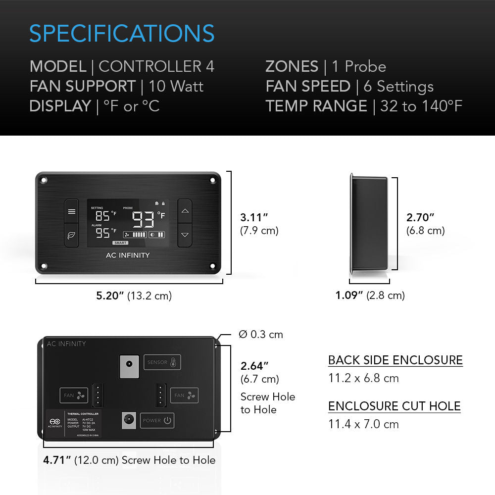 The included intelligent controller features an on-board processor with active temperature monitoring that will automatically adjust fan speeds to respond to varying temperatures. For non-cooling ventilation applications, the controller can provide a readout of the duct fan's speed and status. The programming can be set to run continuously at customizable speeds with easy shut-off and power on-off memory. Additional features include an alarm system, eco-mode, display lock or off while programs are running, three backlight settings, and two buffer options. It also includes a detachable 8' precision thermal probe that is water resistant.