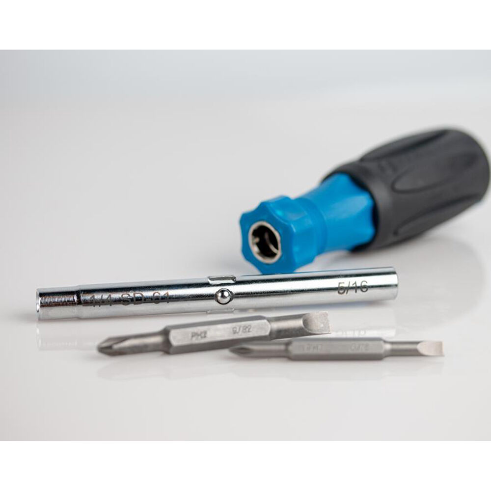 The Jonard Tools SD-61 6-in-1 Multi-Bit Screwdriver with Phillips and Slotted Bits eliminates the need for multiple tools in your belt. This tool can be configured to six types of driving heads: #1 and #2 Phillips, 9/32" and 3/16" cabinet slotted, and 5/16" and 1/4" nut driver heads.