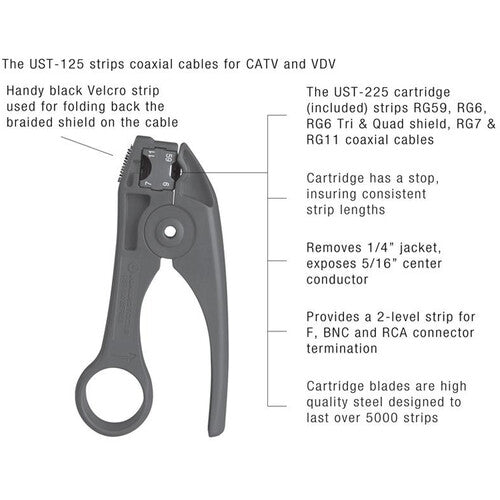 - The blade cartridge (UST-225) provides a 2-level strip for F, BNC, and RCA connector termination