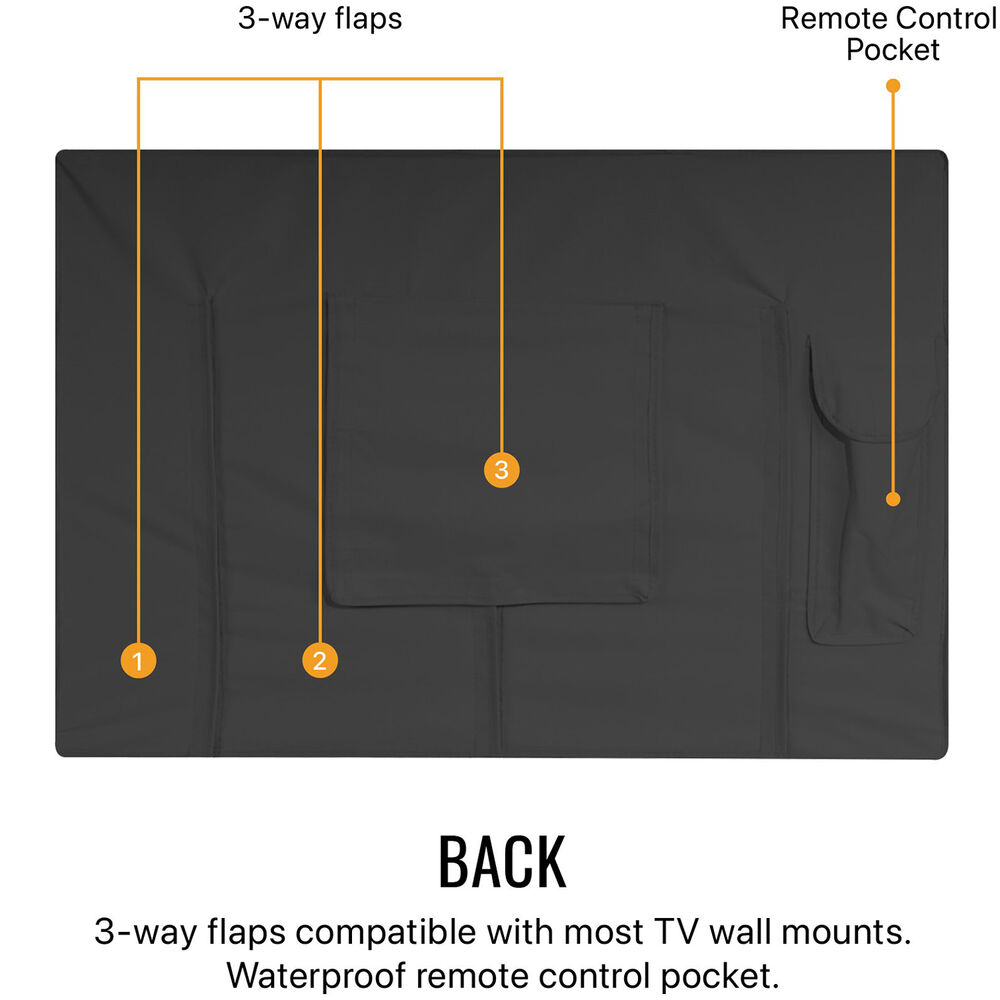 Whether you decide to put your television on a patio, or an outdoor deck, or by the pool, the black KOHMO GEAR Outdoor TV Cover provides all-season protection for your valuable flat-panel TV. Engineered to withstand harsh conditions, from the tropical north down to the cooler south, you can rest easily knowing your TV is protected all year round against dust, insects, UV rays, ice, and condensation, with this television cover. The television cover is made of a unique material that allows it to breathe while keeping out water, wind, and moisture. What this means is that mold and moisture will not build up underneath the cover with changes in the ambient temperature or humidity. As a result, your TV is safe not damaged, nor rendered inoperative due to sweating. A softer internal lining and a handy remote-control pocket means you have the ideal cover to enable your TV to be protected 365 days a year. Protect your television to ensure your equipment is ready to use at any time, even in winter or summer.