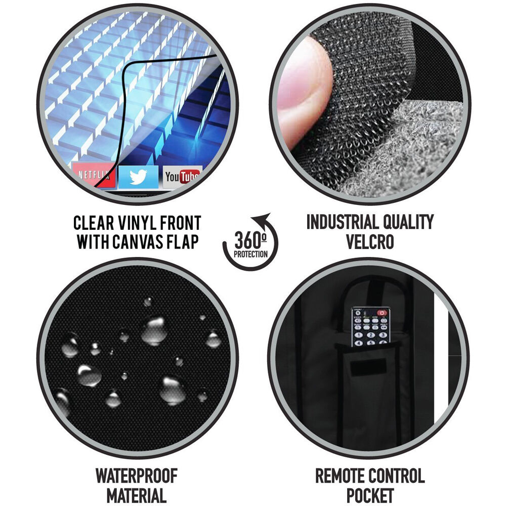 Whether you decide to put a television on a patio, an outdoor deck or by the pool, the KHOMO GEAR Outdoor TV Cover with Clear Front provides all-season protection for your valuable flat-panel TV. It's engineered to withstand harsh conditions from the scorching sun to the unforgiving cold, so you can rest easy knowing your TV is protected all year 'round against dust, insects, UV rays, ice, and condensation.