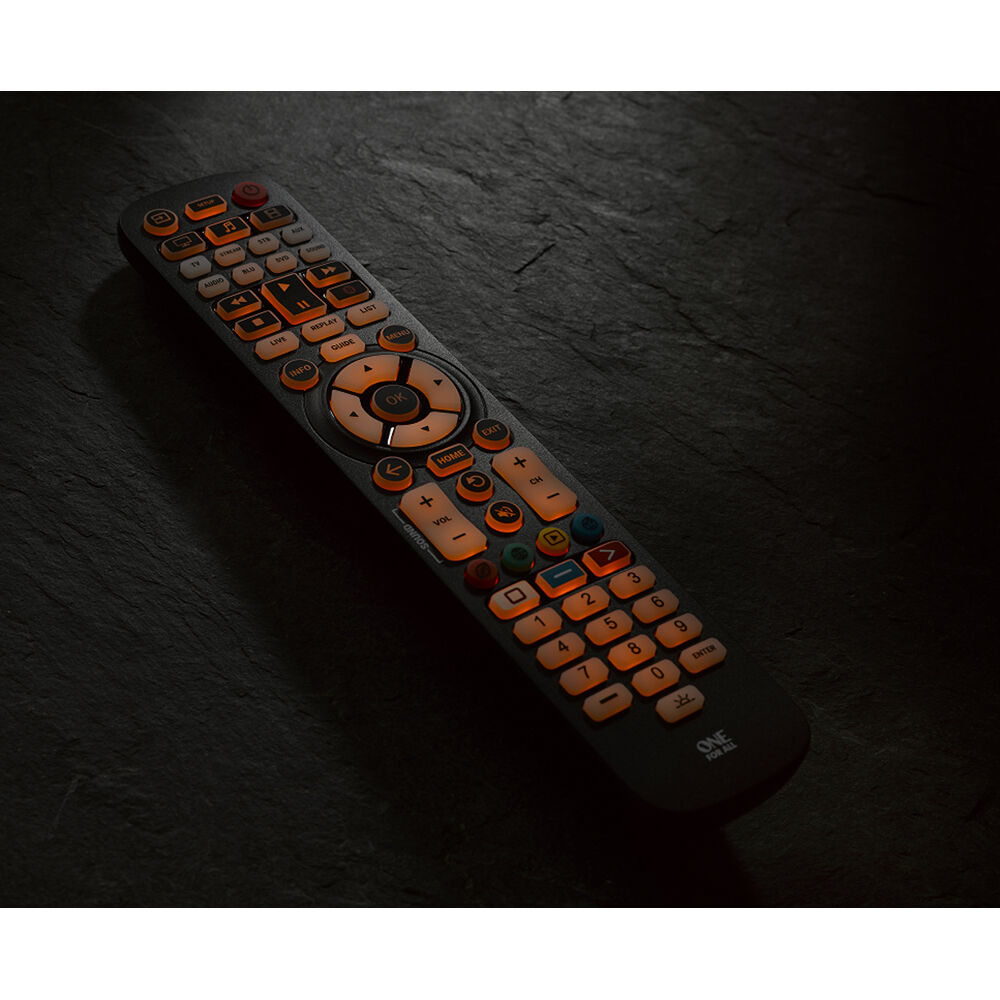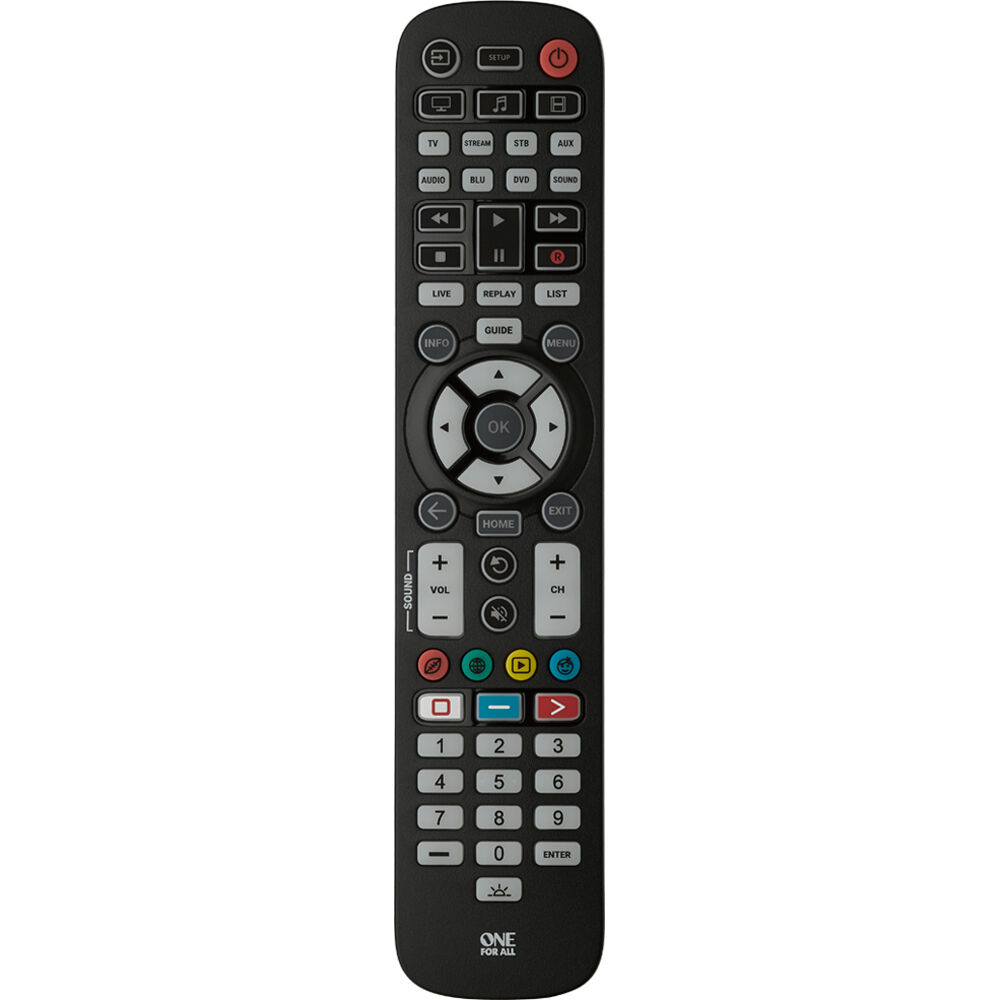 Control up to eight devices in your home entertainment setup with the One For All URC3680 Essential 8 Antimicrobial Universal Remote Control. The Essential 8 is a universal remote control for TVs, set-top boxes, streaming media players, Blu-ray/DVD players, and soundbar and audio devices.