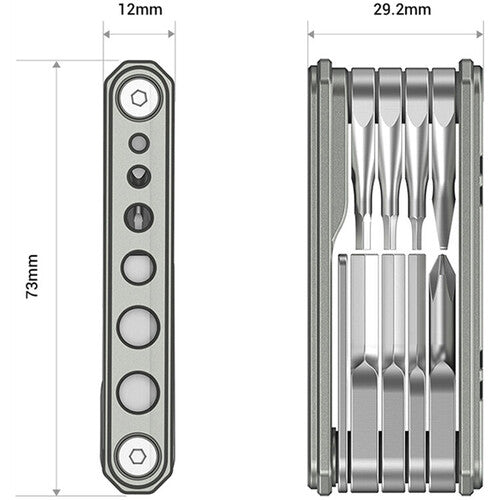 The pocket-sized Universal Folding Multi-Tool from SmallRig provides nine fold-out tools useful for working with video cameras, rigs, and gimbals. Constructed with stainless steel tools and an aluminum casing, this multi-tool includes two flat head screwdrivers, 3/16, 1.5, 2, 2.5, 3, and 4mm Allen wrenches, and a Phillips head screwdriver. Threads on the side provide storage for M2.5, M3, M4, M5, and 1/4"-20 screws.