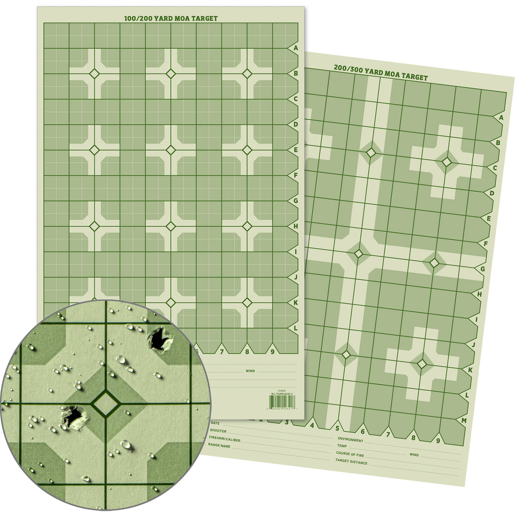 With shaded green cross designs and alphanumeric indicators, this 25-pack of Precision Distance Shooting Targets from Rite in the Rain will help you get the most of your time at the range. Each 11 x 17" target has grids for 100-200 yards on the front and 200-300 yards on the back. Green is the easiest color to see, and the 1 MOA pattern, along with alphanumeric indicators along the side and bottom, make it easy to aim and to evaluate your shots. Rite in the Rain's 32-pound paper maintains its integrity even in the rain and allows for clean exit holes, so you can see even tight groups from the bench or through your optic.