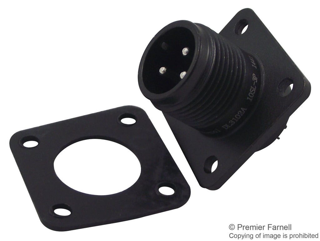 The DL3102A10SL-3P is a 3-contact Pre-Earth/FMLB Connector, box mount receptacle shell, 10SL-3 insert arrangement and pin contact type. The pre-earth/first mate last break (FMLB) connector is designed for applications where a protective circuit from the ground contact to the shell is a safety requirement. This connector provides a path for any stray voltage to be shunted to a safe ground avoiding harm to the operator and the voltage sensitive equipment. The DL series connector employ shells and inserts to MIL-C-5015 styles and arrangements. They utilize solder cup contacts and aluminium shells. When mated, this connector meets class IP67 protection against water and dust.