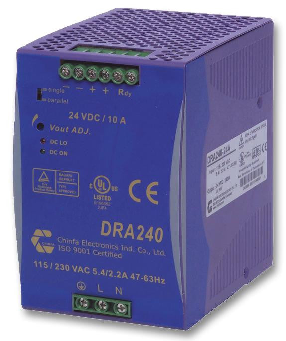 This is a AC/DC DIN Rail Power Supply (PSU), Active PFC, 1 Output, 240 W, 24 VDC, 10 A product from MULTICOMP with the model number DRA240-24A