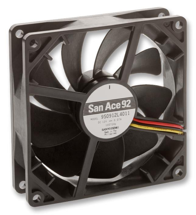 This is a Axial Fan, San Ace 92 Series, 12 V, DC, 92 mm, 25 mm, 27 dBA, 44.5 cu.ft/min product from SANYO DENKI - SANACE FANS with the model number 9S0912F4011