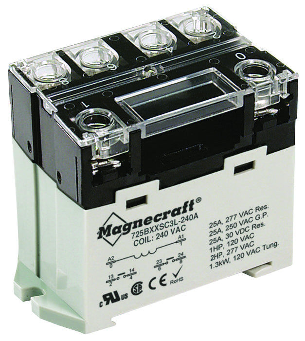 This is a RELAY, DPST-NO, 277VAC, 30VDC, 25A product from SCHNEIDER ELECTRIC/MAGNECRAFT with the model number 725BXXSC3ML-24D