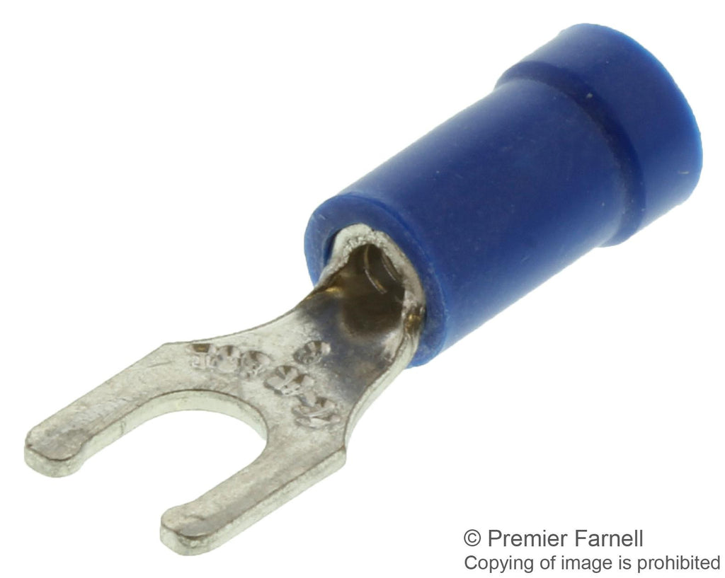 This is a TERMINAL, SPADE/FORK, #8, CRIMP, BLUE product from THOMAS & BETTS with the model number 14RB-8FL