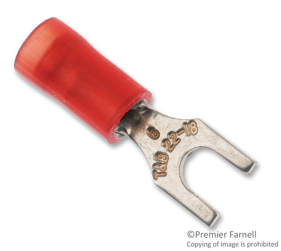 This is a TERMINAL, SPADE/FORK, #6, CRIMP, RED product from THOMAS & BETTS with the model number RA18-6F