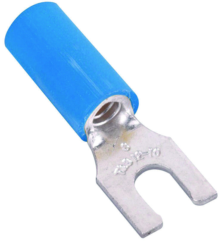 This is a TERMINAL, SPADE/FORK, #8, CRIMP, BLUE product from THOMAS & BETTS with the model number RB14-8FL