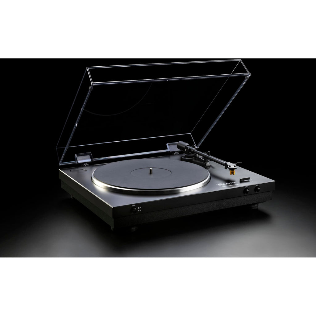 To provide high-quality playback with low resonance, Dual Electronics crafted the plinth from solid MDF and plastic, equipping it with feet that are integrated with vibration-absorbing elastomer material. The diecast aluminum platter comes with a heavy rubber mat that further dampens resonance during playback. Finally, the DC motor is moved from under the platter to the side and is belt driven with rubber mountings for vibration decoupling.