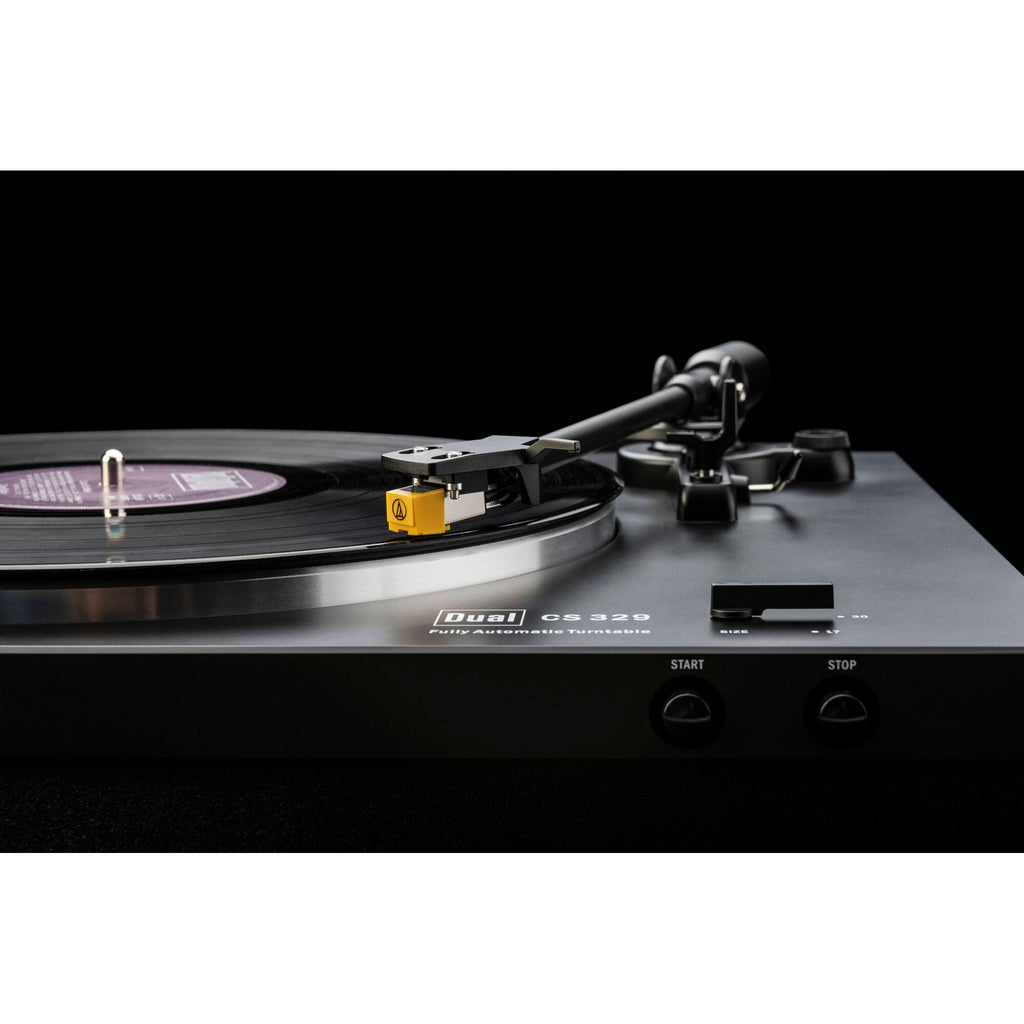 Experience the warmth of analog sound with the easy-to-setup, plug-and-play CS 329 Fully Automatic Two-Speed Turntable from Dual Electronics. With a built-in phono preamp, you just have to connect the fixed RCA audio cable to your existing audio system or pair of powered speakers. After that, all you need to do is put a record on and press Start. The factory-tuned tonearm will automatically raise and place the Audio-Technica AT91 cartridge's needle on the record. After the last track, the tonearm will raise and move back to the holder, or you can press Stop to have it happen sooner.