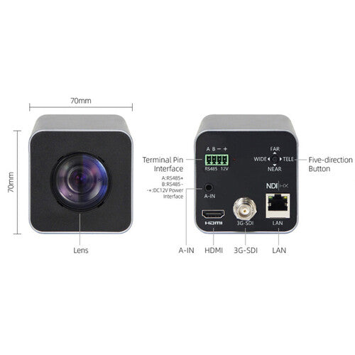 Add a high-quality, multifunction box camera to your conference room, event space, education environment, or house of worship with the black POV X HDMI/SDI/NDI HD Box Camera with 20x Zoom from PTZCam. The camera features a 1/2.8" CMOS sensor and simultaneously outputs up to 1080p60 video over HDMI and 3G-SDI, and you can also utilize the NDI protocol that works with any NDI network.