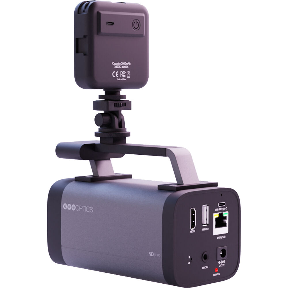 Other features include a built-in noise-cancelling microphone array, a microphone input, NDI|HX, SRT/RTMP/RTSP streaming support, 12x optical zoom, 16x digital zoom, and a wide 72.5° field of view. An LED panel is included to illuminate your scene, and it can mount on top of the camera, using the integrated shoe mount on the top handle. You can remotely control the camera operation, using the included IR remote control.