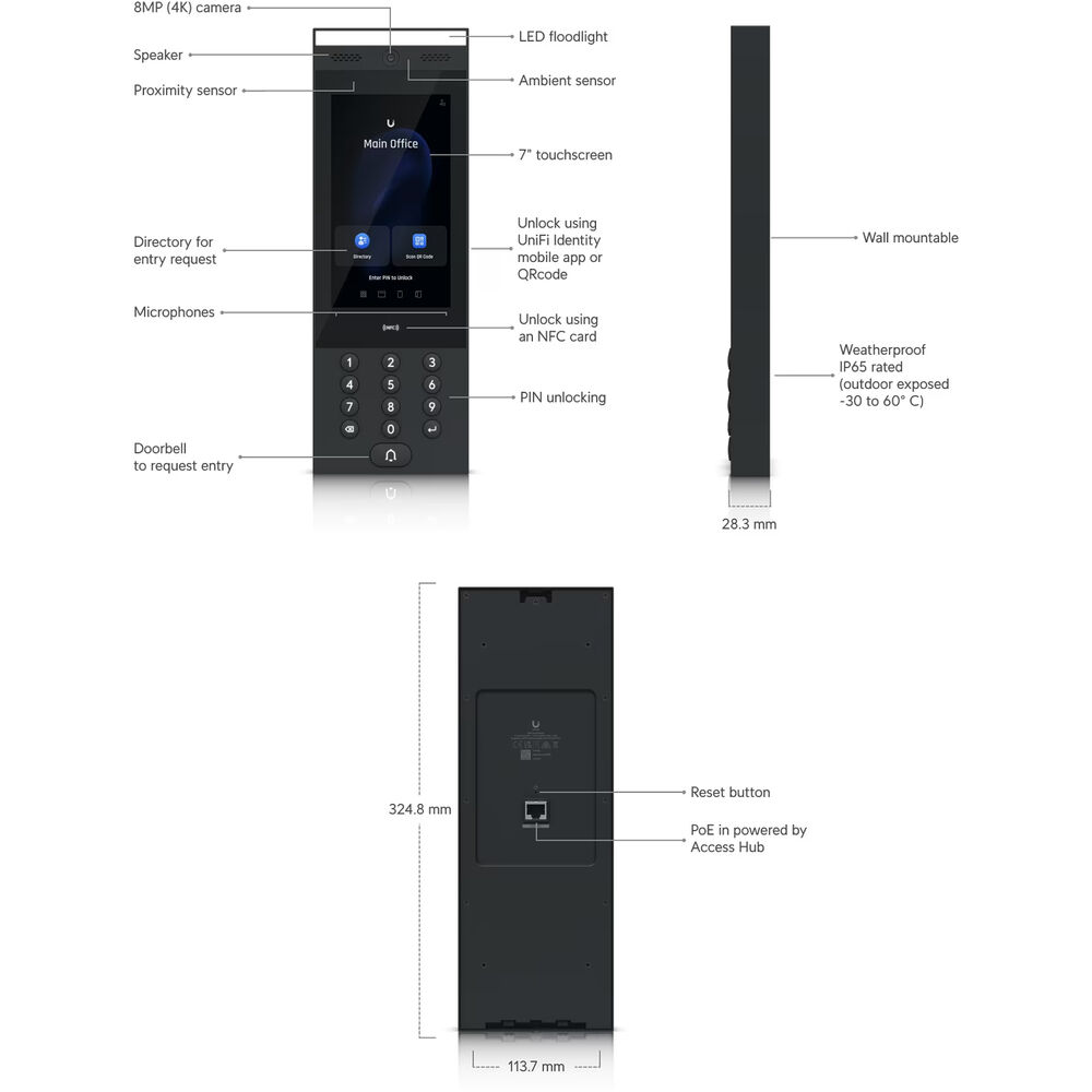 This unit features PoE connectivity via a UniFi Access Hub (available separately), along with BLE 4.2 and GbE Ethernet connectivity. It is housed in an IP65-rated enclosure for protection from water and dust.