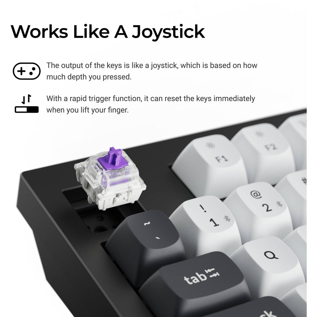 Elevate your typing and gaming experience with the Q5 HE QMK Wireless Keyboard from Keychron. Featuring 2.4 GHz RF and Bluetooth 5.2 connectivity, this keyboard utilizes Gateron double-rail magnetic hall effect Nebula switches for pressure sensitive inputs, lightning-fast response time, and adjustable actuation points.