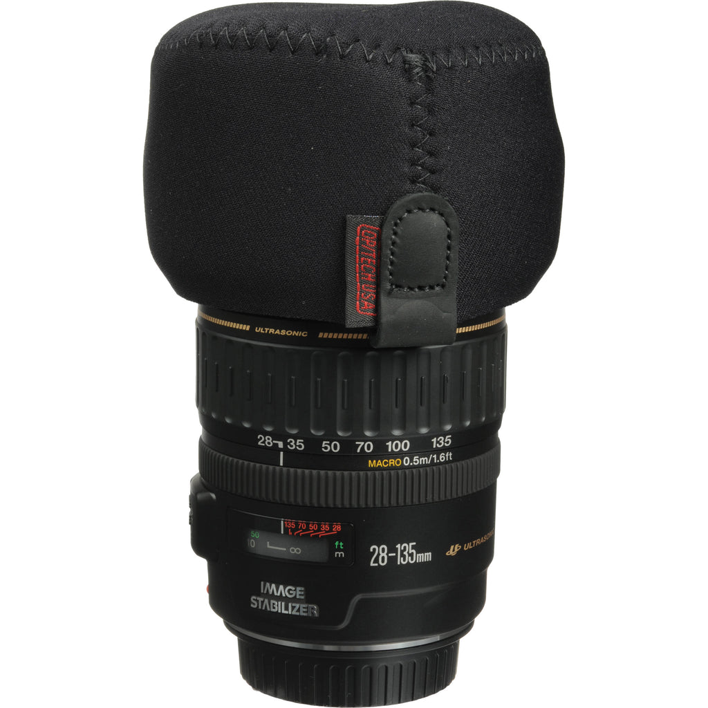 The black, medium OP/TECH USA Hood Hat is designed to fit a lens and shade with a diameter from approximately (8.9 to 10.3 cm). Simply placing the Hood Hat onto the front of the hood while in place will provide just as much protection for the critical front lens elements as would be provided by a traditional lens cap. The neoprene material will adjust to fit both round and elliptical "petal-type" shades.