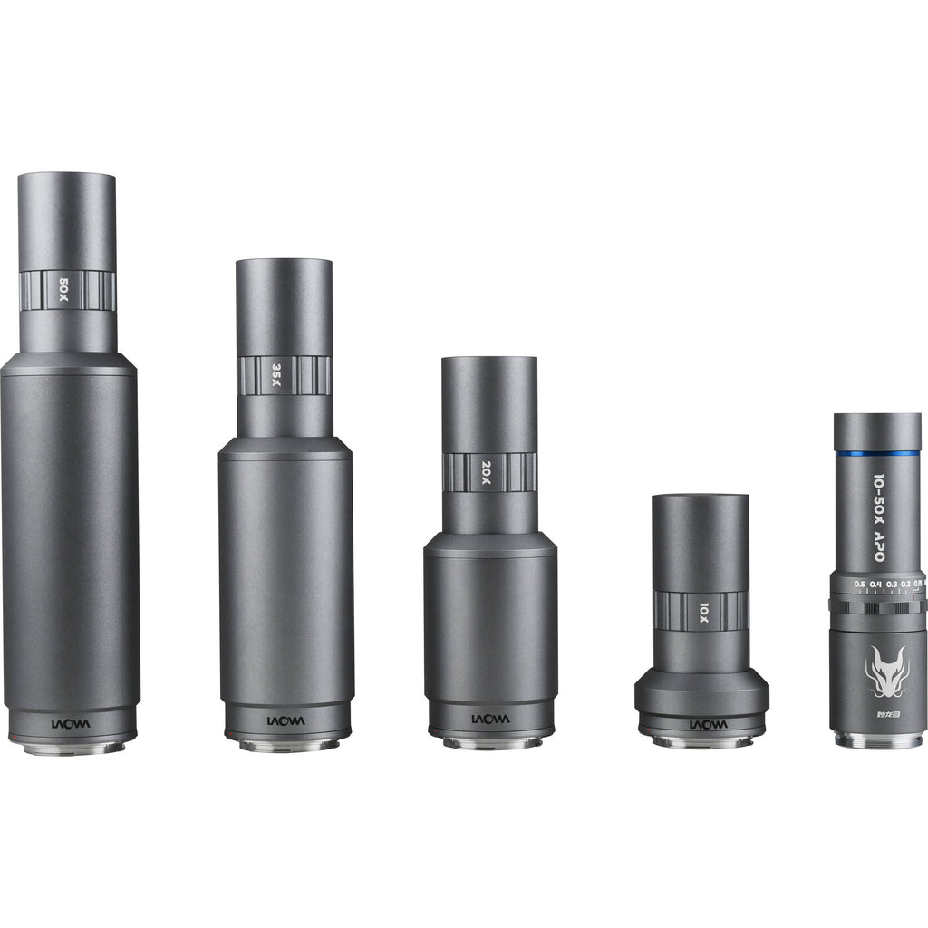 The Laowa Aurogon FF 10-50x Supermicro Lens for Canon EF mounts from Venus Optics offers a solution for those interested in microphotography but also seeking the convenience of using conventional DSLR cameras. The lens system works in two parts: a primary lens and a set of four magnifying elements in 10, 20, 35, and 50x which can be swapped out for your desired strength. The lens has a set 20mm focusing distance, which is consistent across all of the magnifying units, making it easy to use and switch between them without having to completely reconfigure your set up. The numerical aperture (NA) ranges from 0.15 to 0.5 and is set manually on the primary lens.