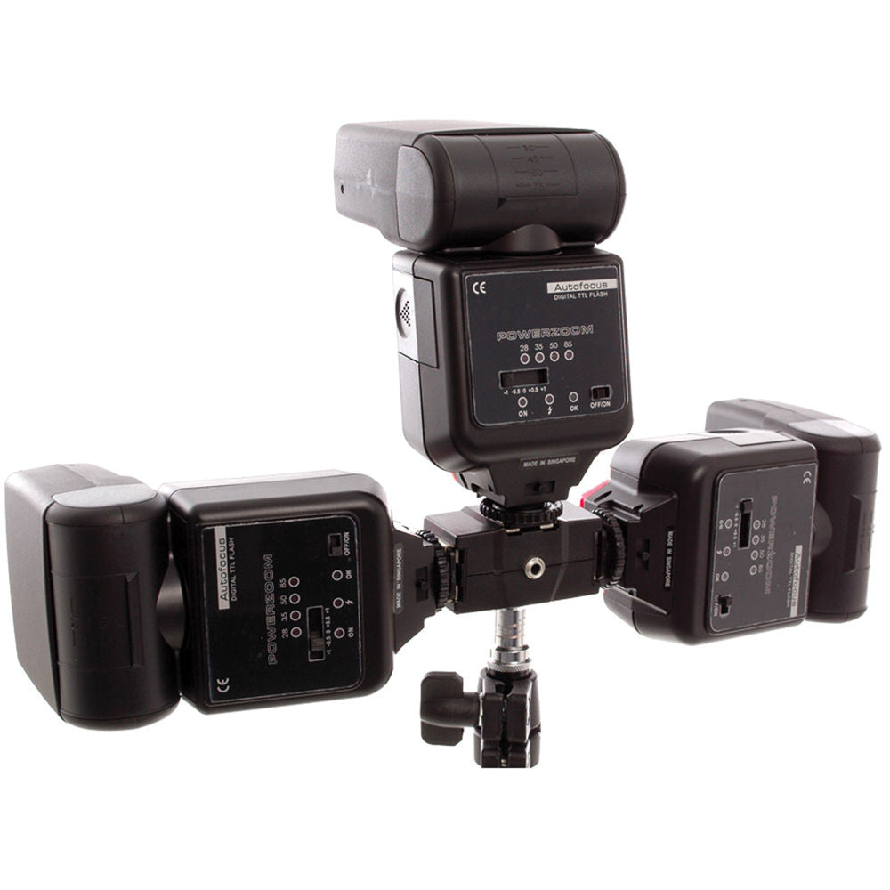 The Triple Flash Shoe 3.5mm Sync from Dot Line Corp is a unique sync adapter that has three hot shoes. Each one features a connection for speedlights that have a locking pin, and the bottom of the device has a 1/4 - 20" female thread--allowing it to be mounted onto a light stand or even a tripod. The adapter is connected to the camera via an optional 3.5mm sync cord or a wireless RF remote that has a 3.5mm mini jack connector. If you need to triple the amount of light you get from a single light stand or tripod, this adaptor will easily take care of all the necessary connections, for a very budget-friendly price.