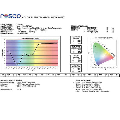 STRAW RoscoStraw Daylight Conversion filters are a series of yellowish amber filters that lower color temperature as needed. Offered as a yellower version of the traditional CTO series and is calibrated to the same color correction and transmission properties.