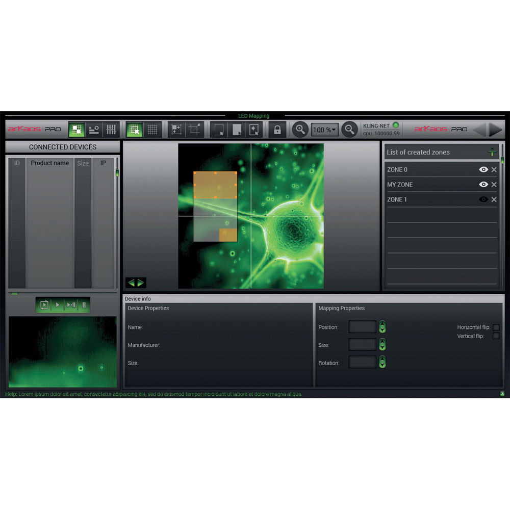 The Mapping mode automatically configures your software and hardware into virtual groups called zones, without the need for programming Art-Net, DMX, nodes, and addressing. The Programming mode allows you to create sequences using a timeline based editor, or utilize the live pattern generator giving you a hands-on interactive approach. Both methods can be used simultaneously and you can import videos from your own library. The Performance mode triggers your custom created sequences live, manually, randomly, or sequentially. Beat detection ensures your visuals are synchronized with the music. The live patterns can generate unique visuals adapted to the sound atmosphere of your show. The LEDMaster software is also compatible with the optional EZ-Kling interface which allows for the connection and control of non Kling-Net fixtures, such as DMX and ArtNet devices.