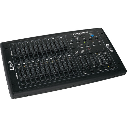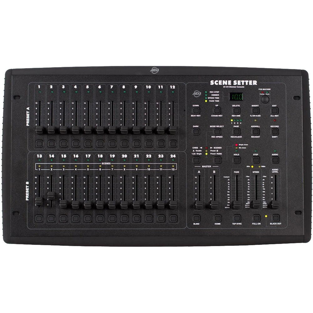 The American DJ Scene Setter 24-Channel Dimmer Board allows you to coordinate audio and visual elements so you can synchronize music with your lights and an optional fog machine, as well as individually control up to 24 channels of incandescent light fixtures. The board uses DMX control protocols to run incandescent lighting using your dimmer packs. You can operate the board as 24 individual faders or as a standard 2 x 12 fader board.