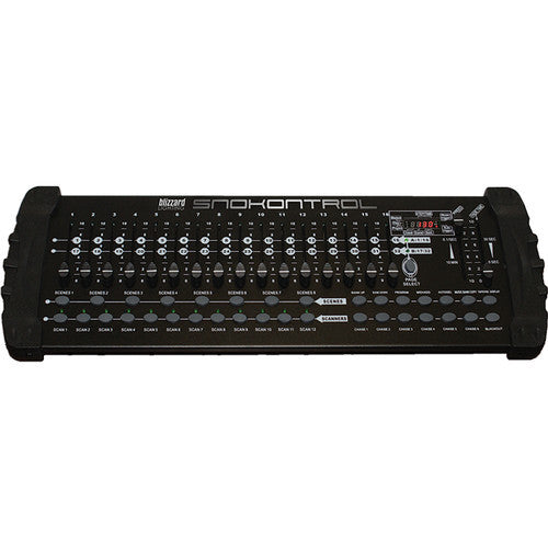 The SnoKontrol DMX Lighting Controller from Blizzard Lighting is a universal lighting controller. It allows the control of up to 12 fixtures composed of 32 channels each and up to 240 programmable scenes. Six chase banks can contain up to 240 steps composed of the saved scenes in any order. Programs can be triggered by music, midi, automatically, or manually. All chases can be executed at the same time. On the surface, SnoKontrol features various programming tools such as 16 universal channel sliders, quick access scanner and scene buttons, and an LED display indicator for easier navigation of controls and menu functions.
