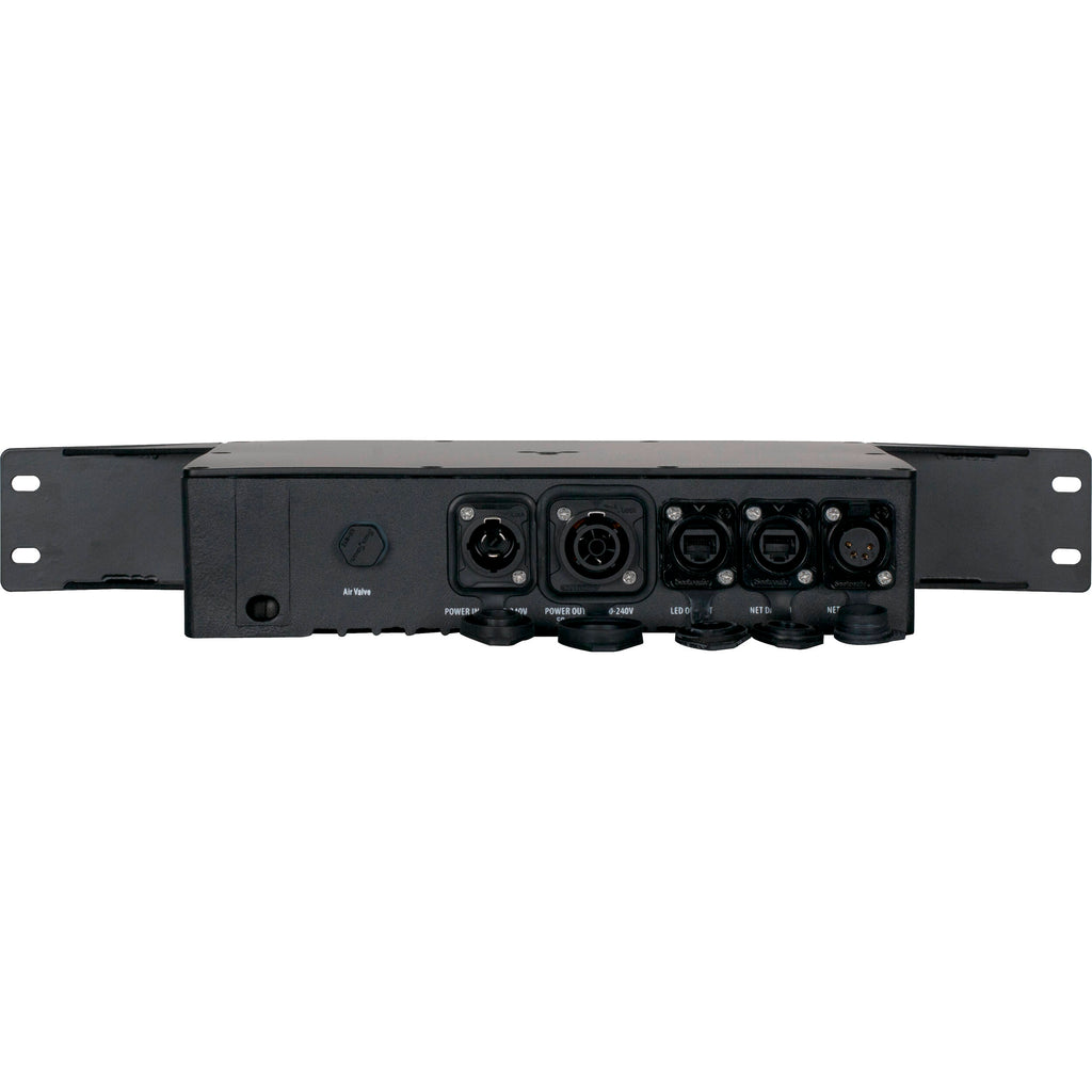 The Pixel Driver 1000IP features a rugged IP65 housing, universal auto-switching power supply (100-240V), 4-button LCD control menu display, RJ45 Ethernet in/out ports, and a proprietary 4-pin IP65 XLR-type output that supplies power and data to the pixel bars connected to it. The Pixel Driver 1000IP can be mounted on a standard 19" rack (rack ears included) or attached to a truss with a Pro clamp (not included).