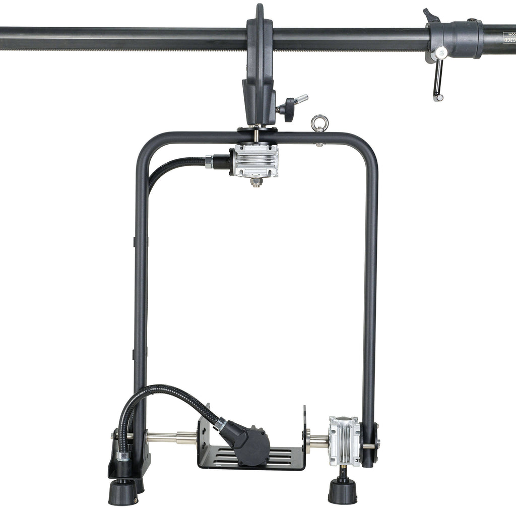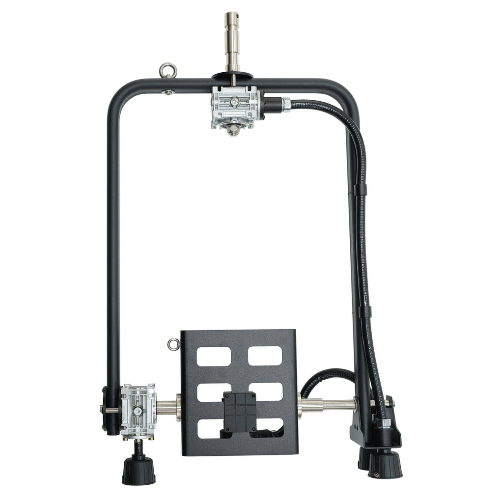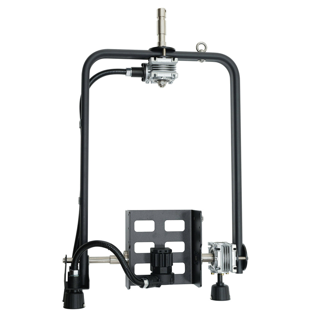 The Pole-Operated Yoke and Fresnel Lens for Evoke 1200B from Nanlux allows the fixture to be hung overhead on a pole or grid. Pan and tilt adjustments are done by engaging the yoke's color-coded cups from below with a long pole. An included glass Fresnel lens with 4-way barndoors mounts onto the yoke.