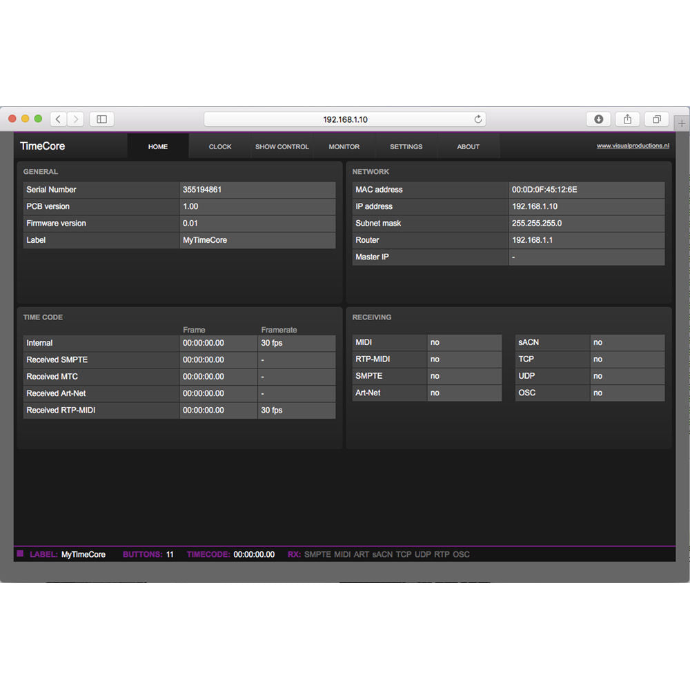 The unit supports receiving and transmitting SMPTE (LTC), MTC and an Ethernet-based timecode (Art-Net). The TimeCore is capable of converting between any of these protocols. It can even convert between different frame rates (24, 25, 29.97, 30).