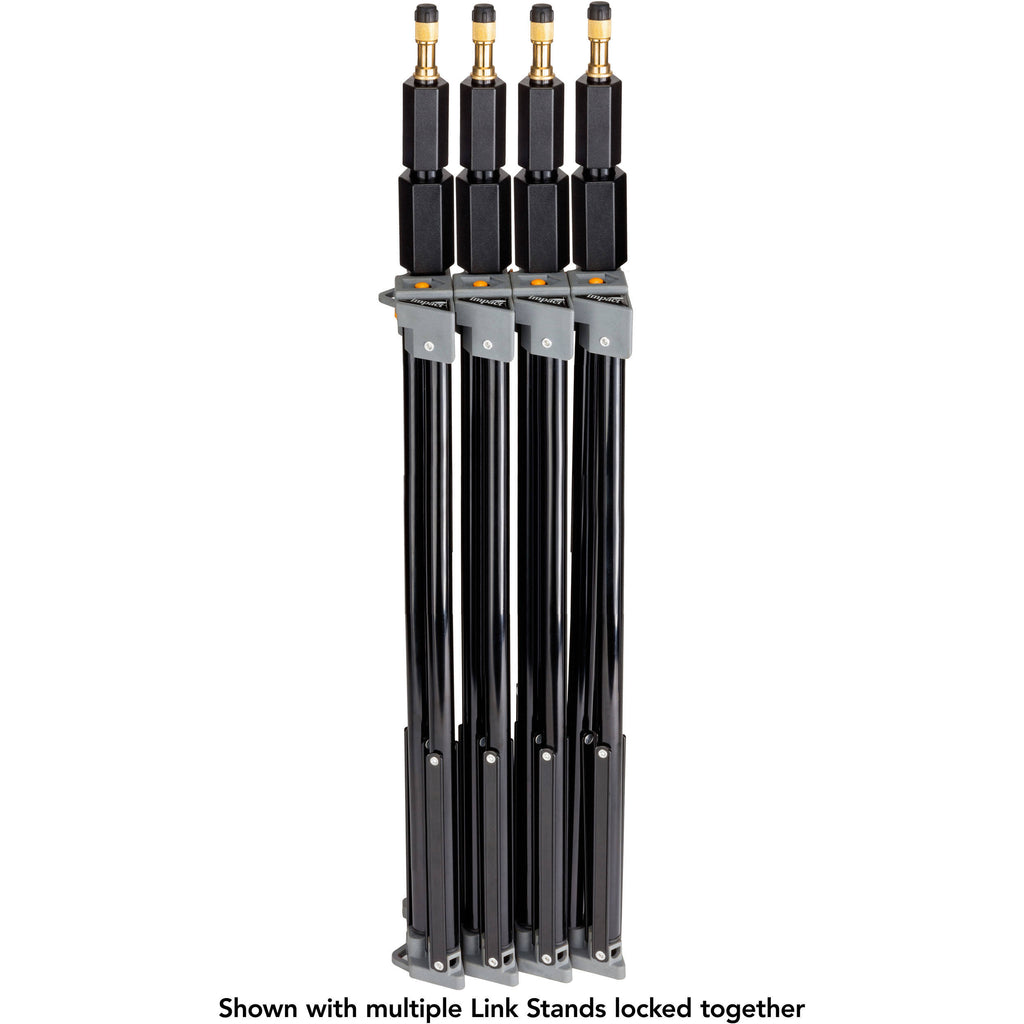 This 9' Link Air-Cushioned Stand from Impact is a standard general-purpose light stand with a unique difference. This stand folds flat and has a locking mechanism with a release button, so it can be locked together with additional stands. When linked together, several stands can be easily carried with one hand. This makes them easy to travel with and store because they take up minimal space when interlocked.