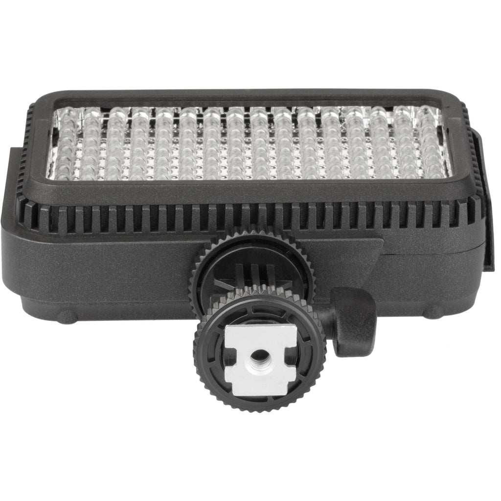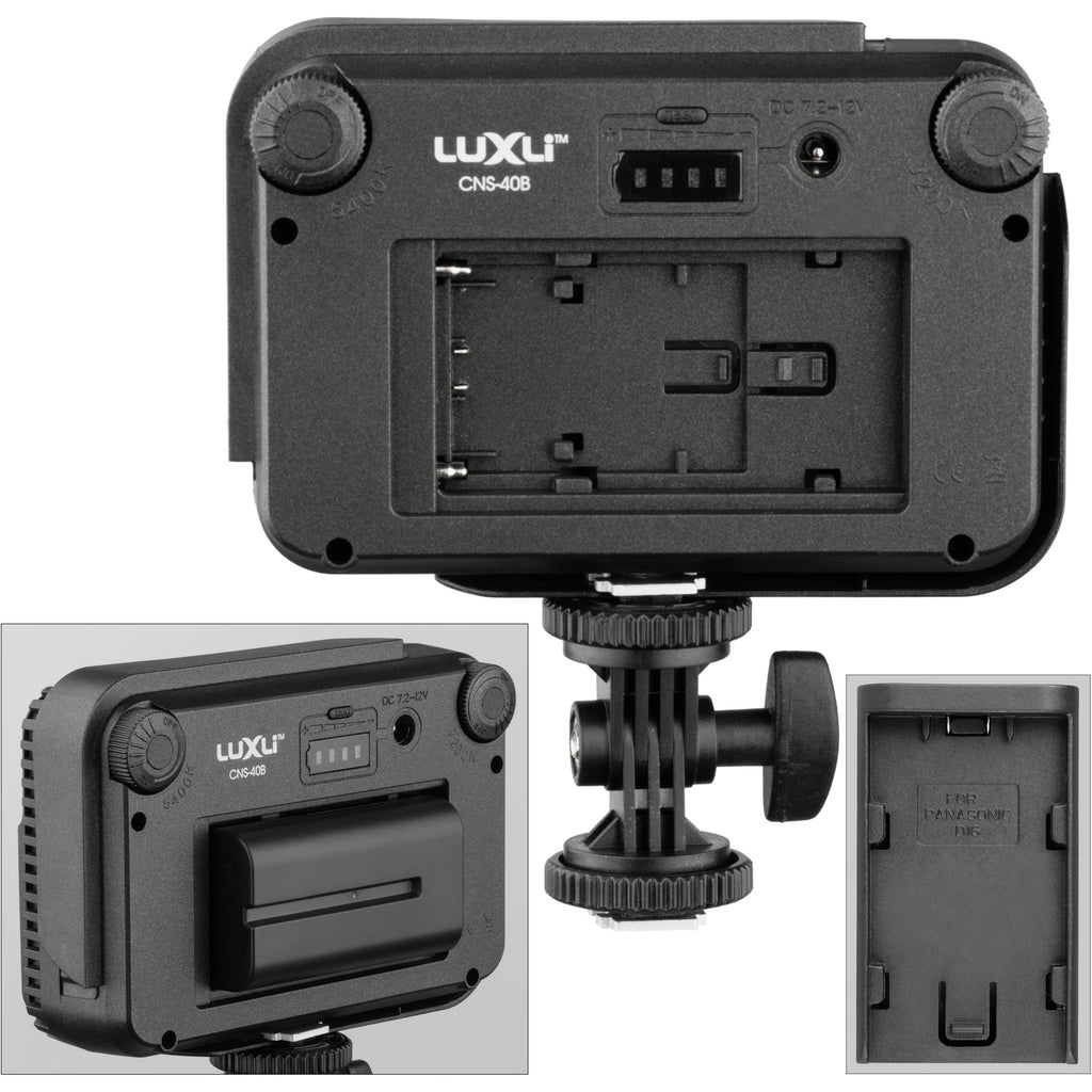 The CNS-40B incorporates a slot that accepts the included articulating shoe mount. A 1/4"-20 threaded mounting hole is incorporated into one side of the mount, enabling you to attach it to either a cold shoe on your camera or use an optional accessory arm with 1/4"-20 threaded stud for mounting. The fixture natively supports Sony L-series, M-series, and H-series batteries and includes adapters that allow you to power it from six-AA batteries or use a Panasonic D16/D28 battery for power. Built into the unit are an on/off dimming knob, a color temperature adjustment knob, and a four-LED battery gauge.