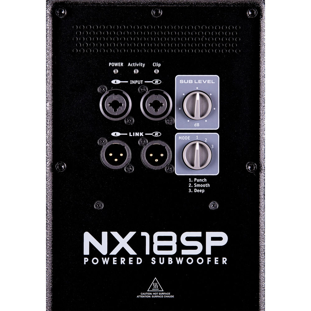 With its 35 Hz low-frequency sound reproduction and ample 134 dB SPL, the NX18SP provides remarkable low-end for it's size. The recessed control panel is stealthy but easy to access, and provides an activity LED and control over main output levels as well as selection between three performance modes (Punch, Smooth, and Deep) that tweak the EQ and tone. The NX18SP features advanced DSP processing with component protection functions and a durable 15mm plywood enclosure with a steel grille for reliable, long-term use. This subwoofer utilizes two XLR-1/4" combo inputs for a single stereo pair and also includes two XLR 3-pin male outputs for use a speaker link.